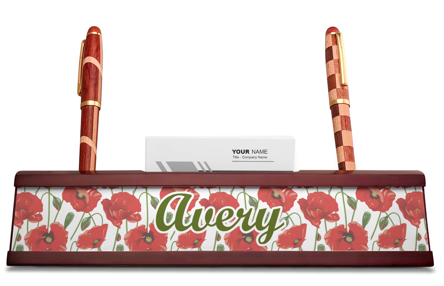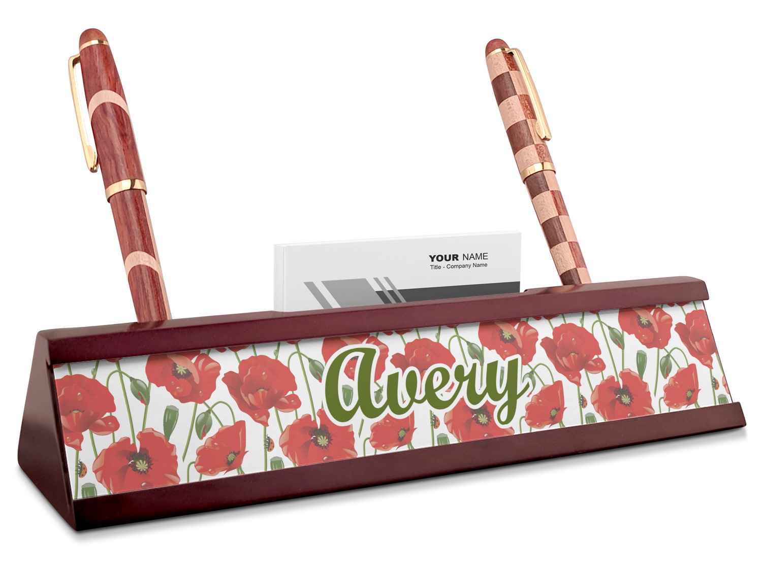 Your desk name plates are crafted from a high-quality, dark-cherry mahogany. At approximately 9.5 by 1.875 by 2.5 inches, this name plaque will fit perfectly, front and center, on your desk. Your customization spans across the entire face of the nameplate. Behind the nameplate lies a skinny slot that can fit approximately 15, traditionally-sized, business cards. You can also store your writing utensils on either side of this custom desk name plate.