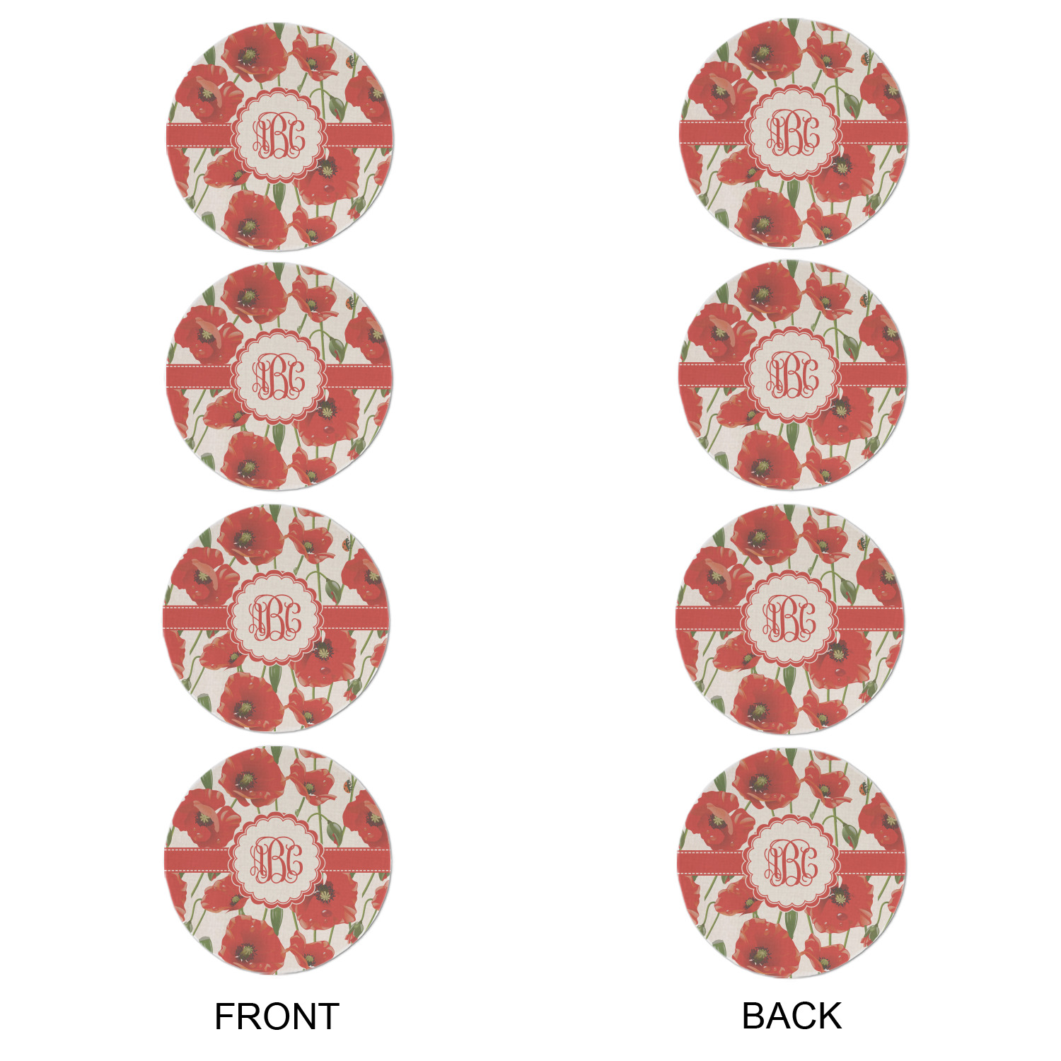 A scalloped label rests in the center of the poppy field, the perfect place for the personalization of your choice.