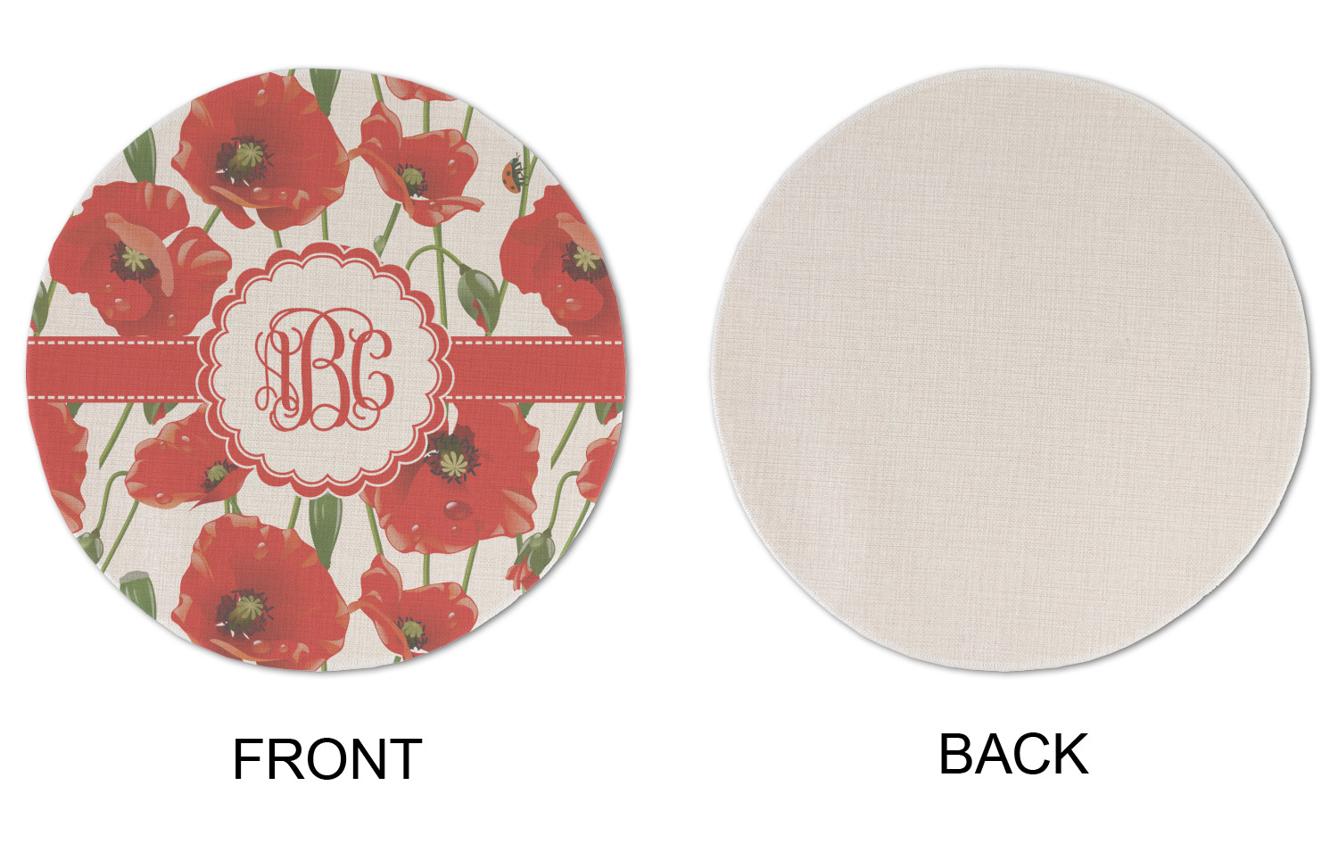 A scalloped label rests in the center of the poppy field, the perfect place for the personalization of your choice.