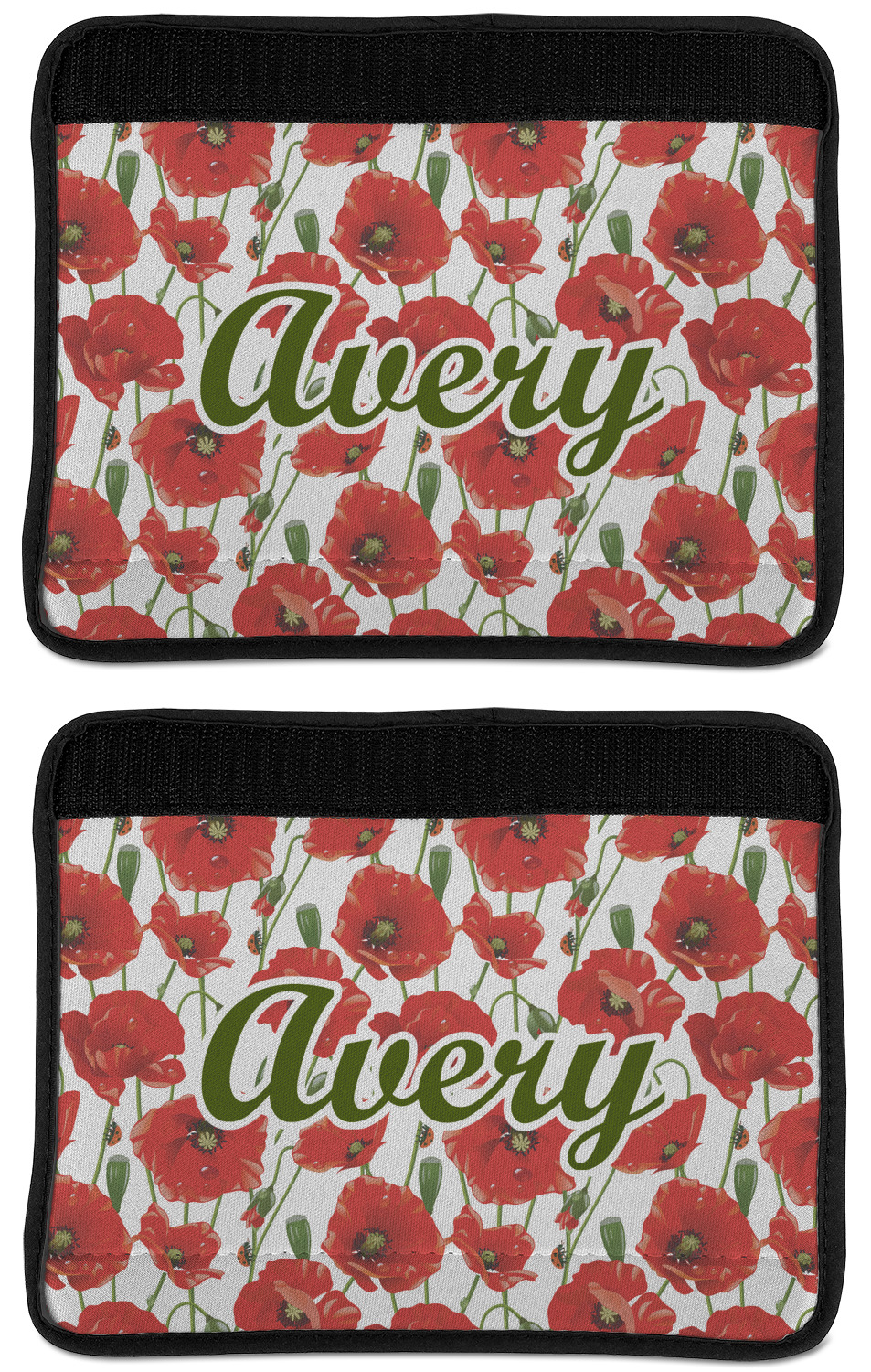 Made from neoprene, our seat belt strap covers wrap around the belt itself and have a Velcro tab for easy attachment and closure. The belt's edges are trimmed with a black polyester for a secure finish. Each cover is 9.5 by 7 inches when open and 9.5 by 2.5 inches when closed. We print your personalized design on the face of the seat belt pad.