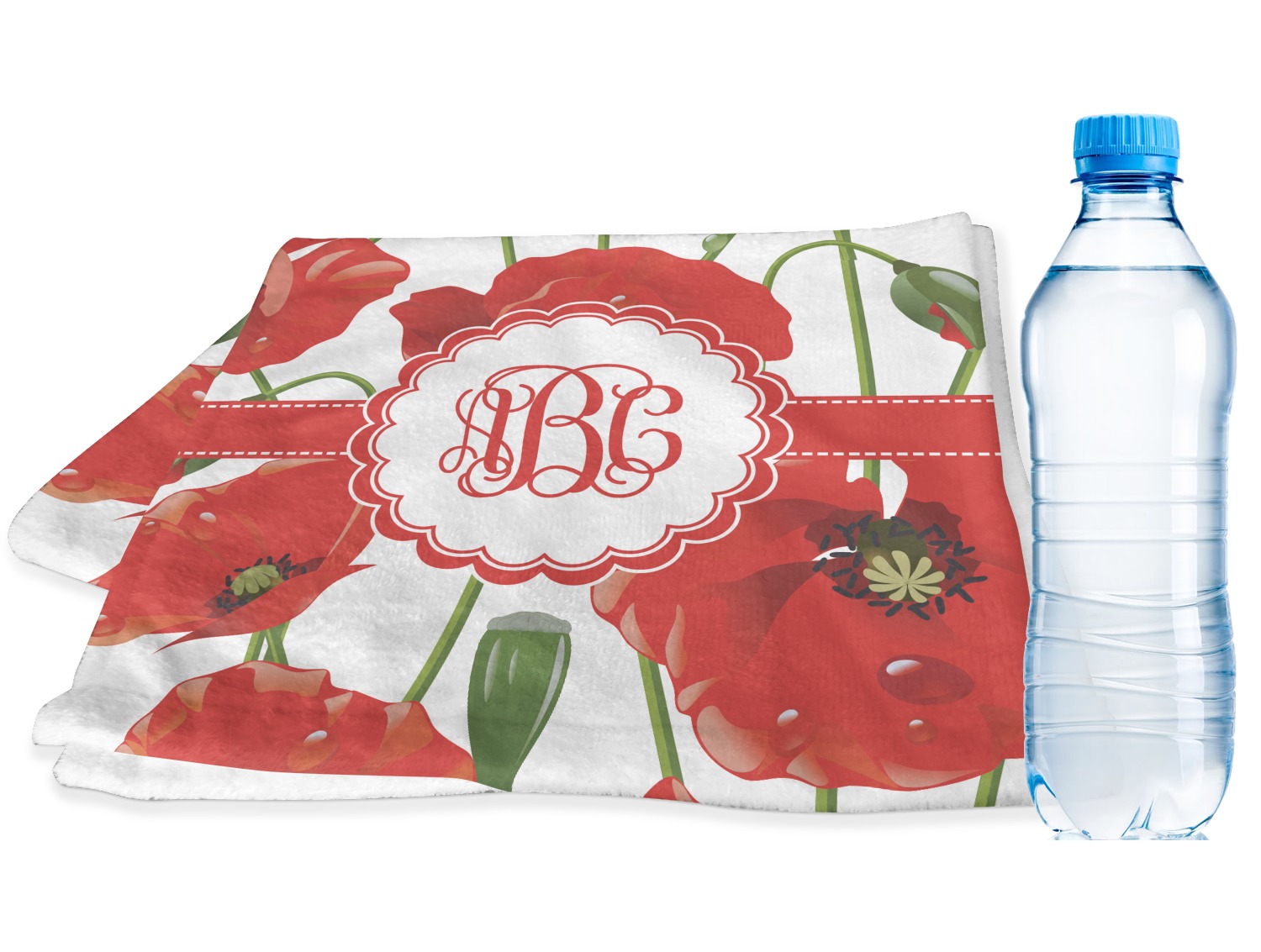 A scalloped label rests in the center of the poppy field, the perfect place for the personalization of your choice.
