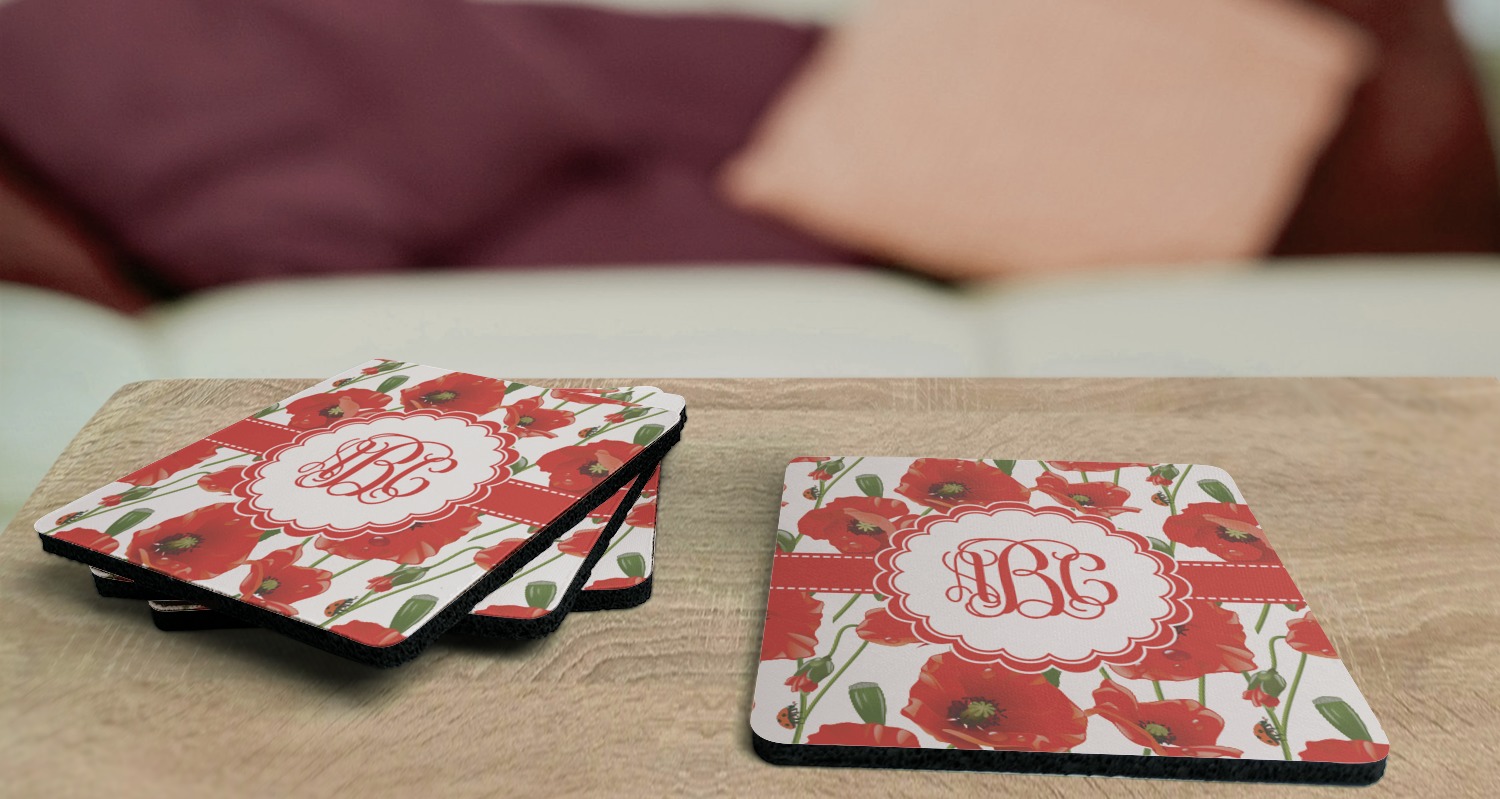 These drink coasters have a smooth, polyester top and a textured, rubber backing on its bottom. The non-slip rubber backing underneath works to keep any spills at bay. At 4 by 4 by 0.25 inches thick, these custom coasters are a suitable size for most drinkware. Your personalization is displayed atop the face of the cup coaster. We sell these rubber coasters in two different shapes: square and round. You can buy each shape as singulars or as a set of 4.