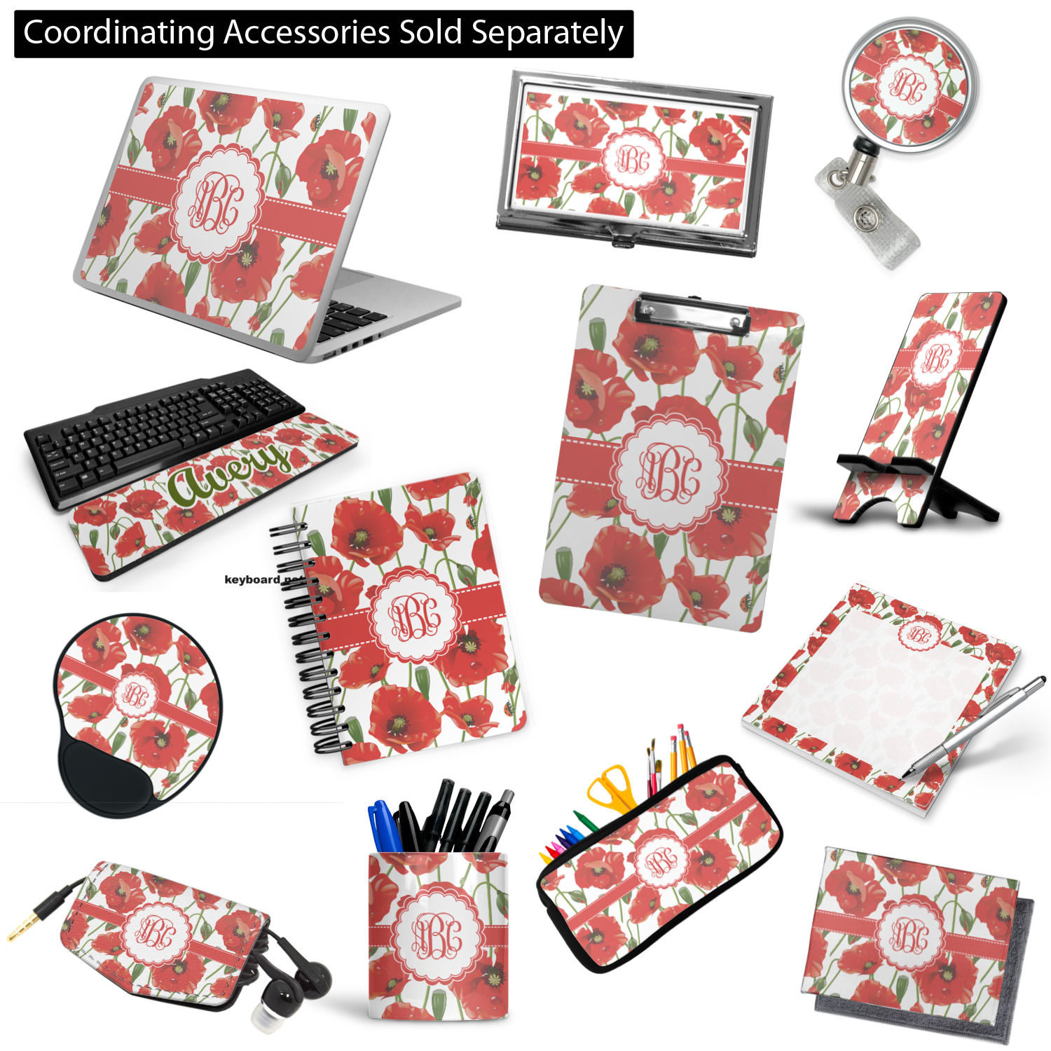 A scalloped label rests in the center of the poppy field, the perfect place for the personalization of your choice.