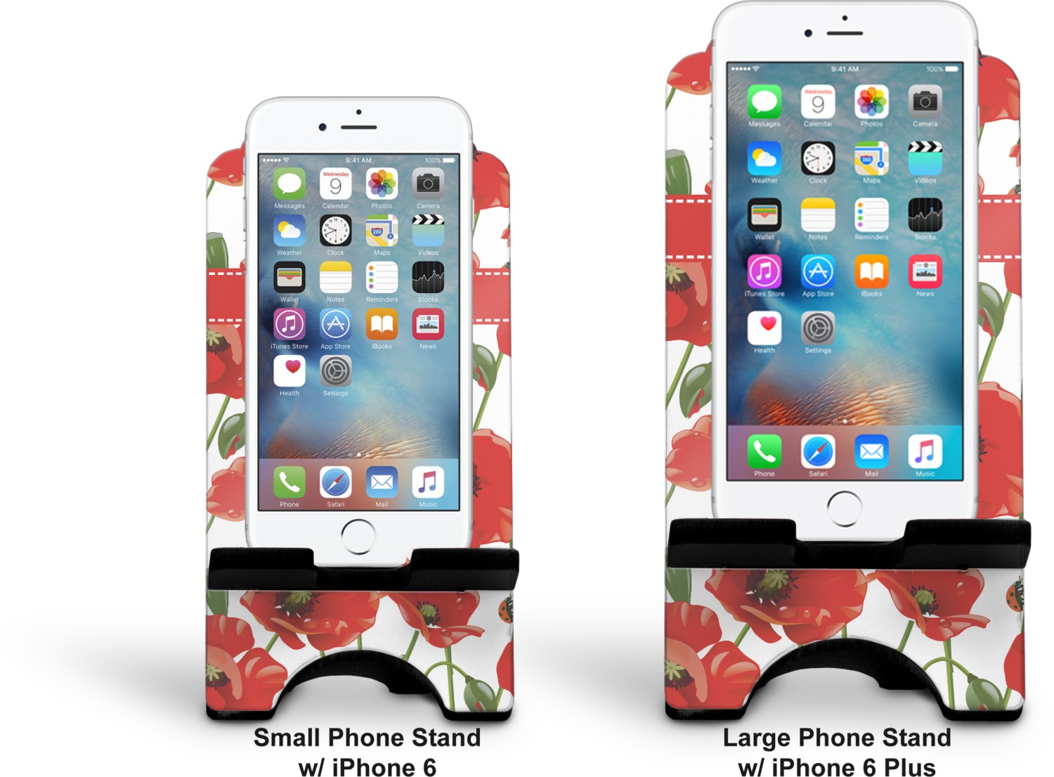 To meet your needs, we offer four variations of this IPhone stand. The backboard of the first version is shaped as a plain, yet sleek rectangle, and is available in two sizes. Our smaller size is approximately 4 by 3.25 by 7 inches, while the larger model is 4 by 3.77 by 8.5 inches. Alongside this model, we also provide you with a more decorative option. The upper part of our second version features a curved edge, for a classy, suave appearance. This phone holder is also sold in two sizes: a smaller version, which is 4 by 3.25 by 7 inches, and our larger model, which is 4 by 3.77 by 8.5 inches. Both models will support large phones, but the larger model is better if you wish to proudly display your personalized design.