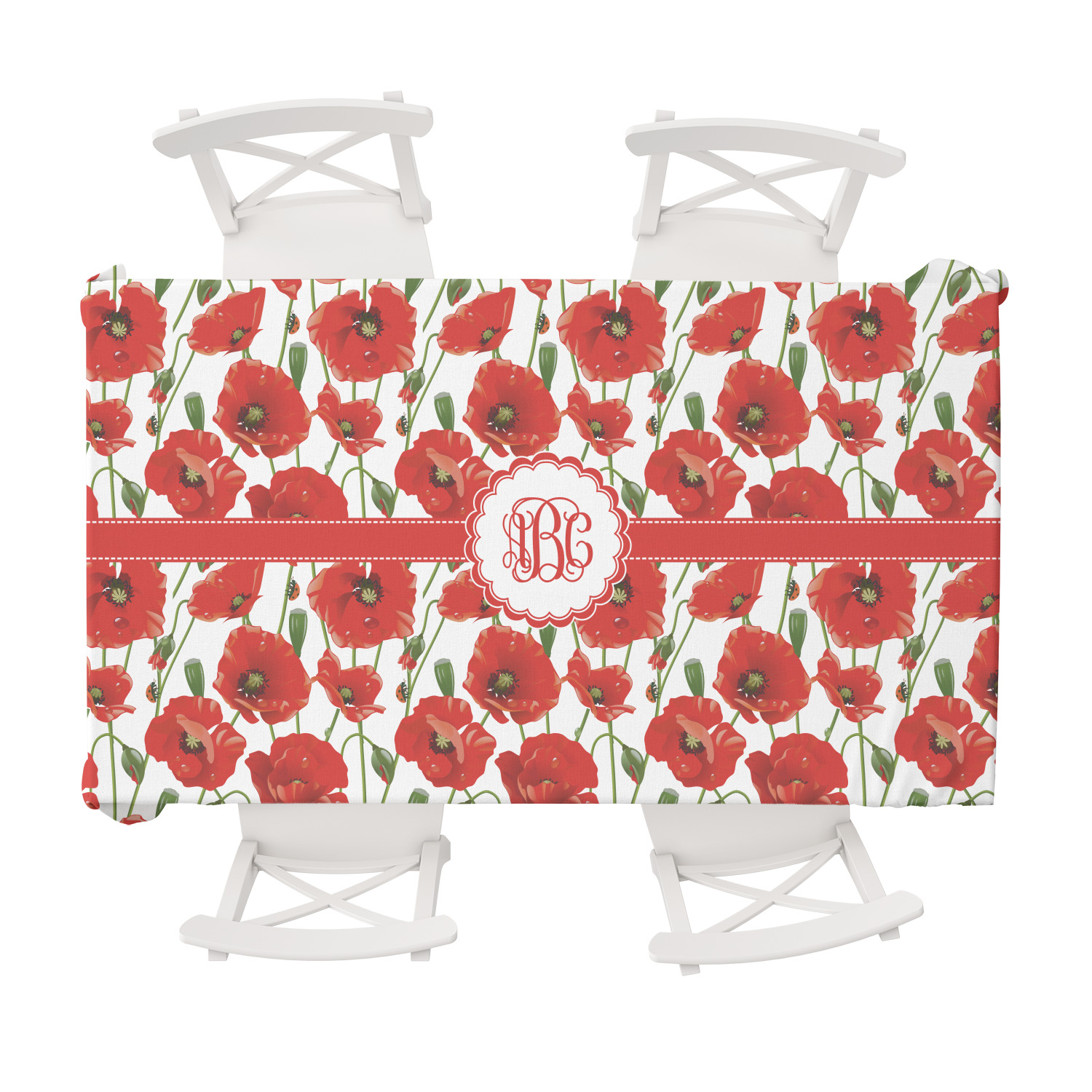 A scalloped label rests in the center of the poppy field, the perfect place for the personalization of your choice.