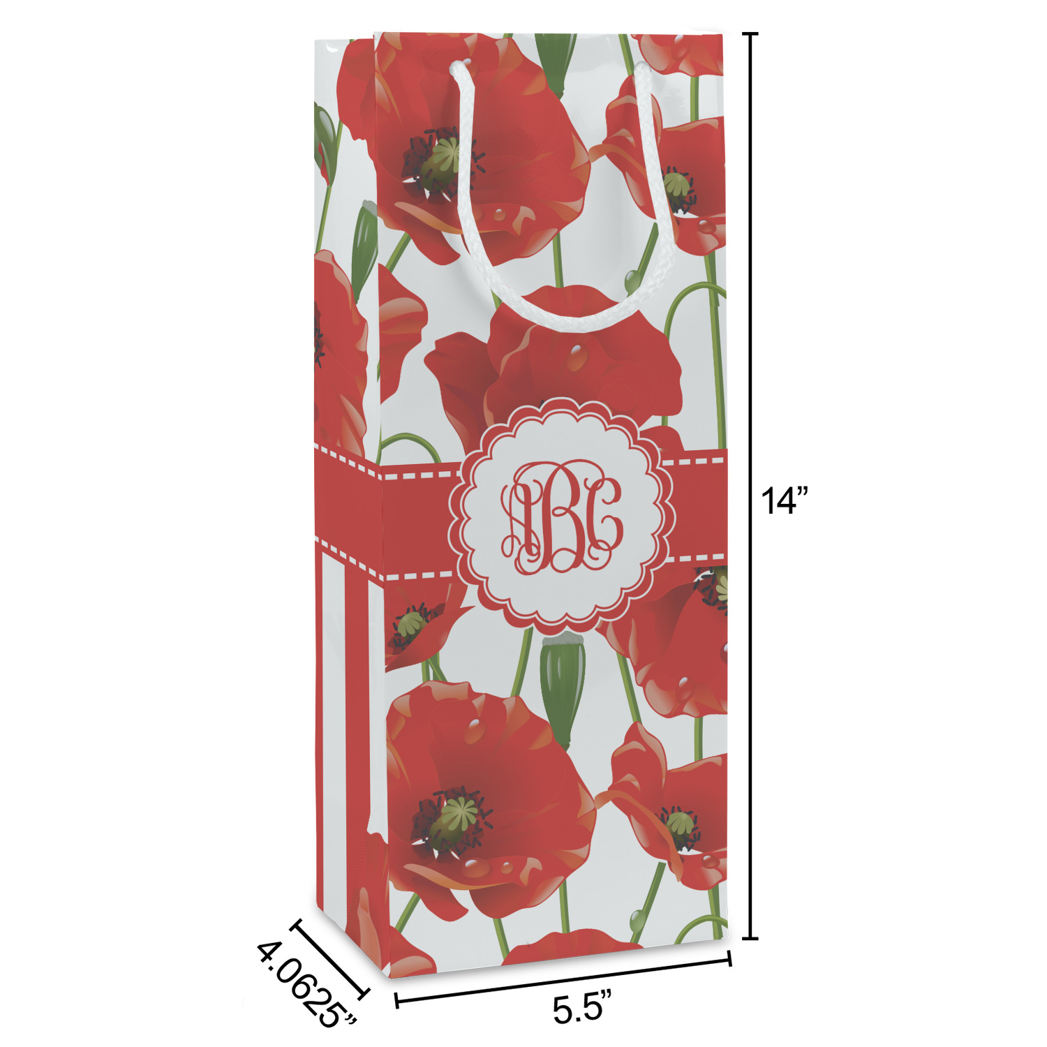 A scalloped label rests in the center of the poppy field, the perfect place for the personalization of your choice.
