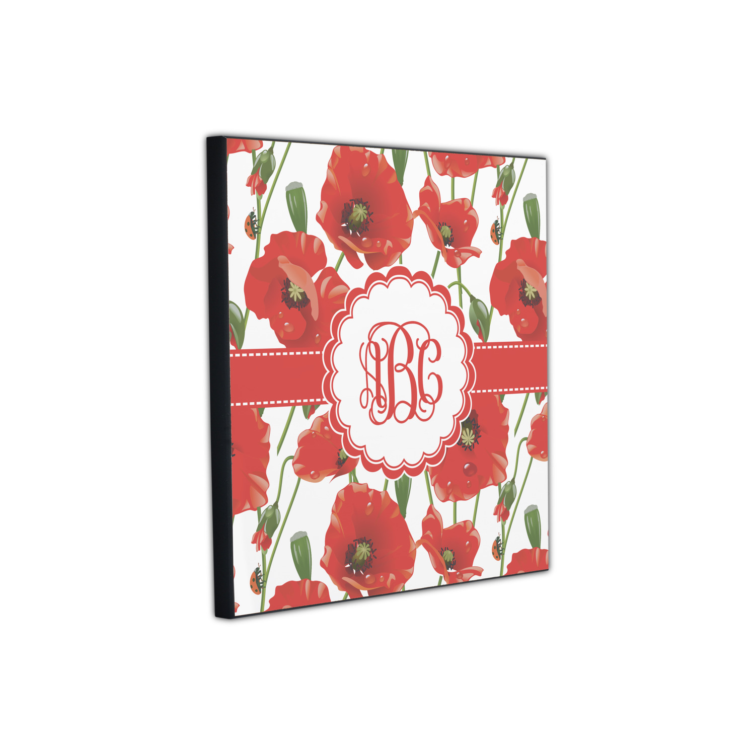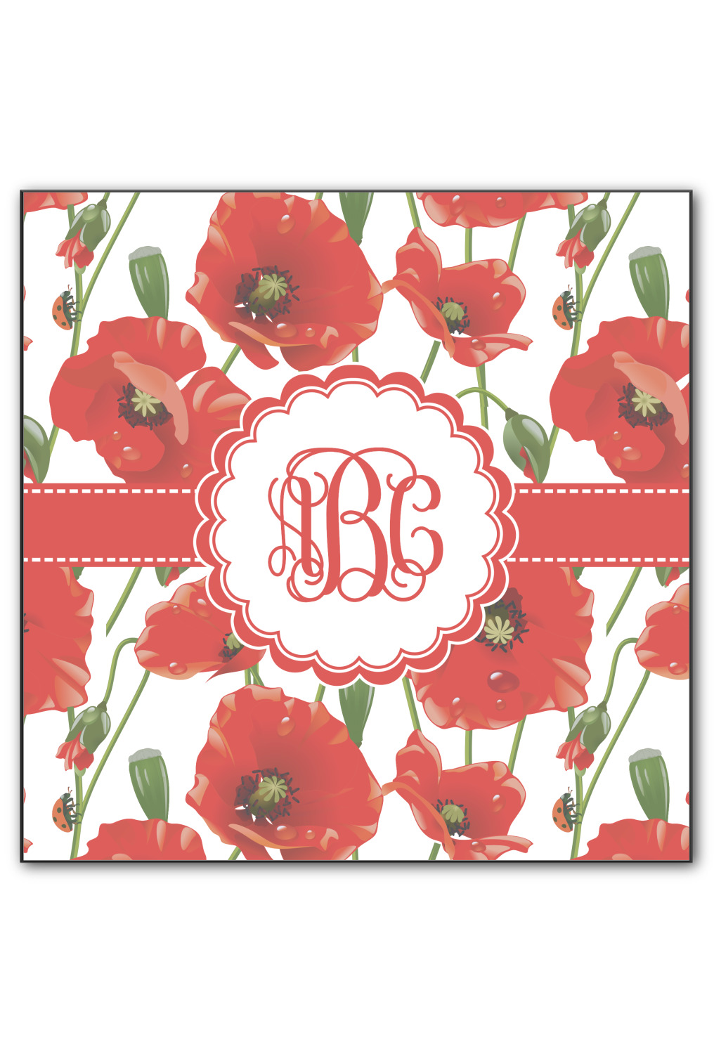 A scalloped label rests in the center of the poppy field, the perfect place for the personalization of your choice.
