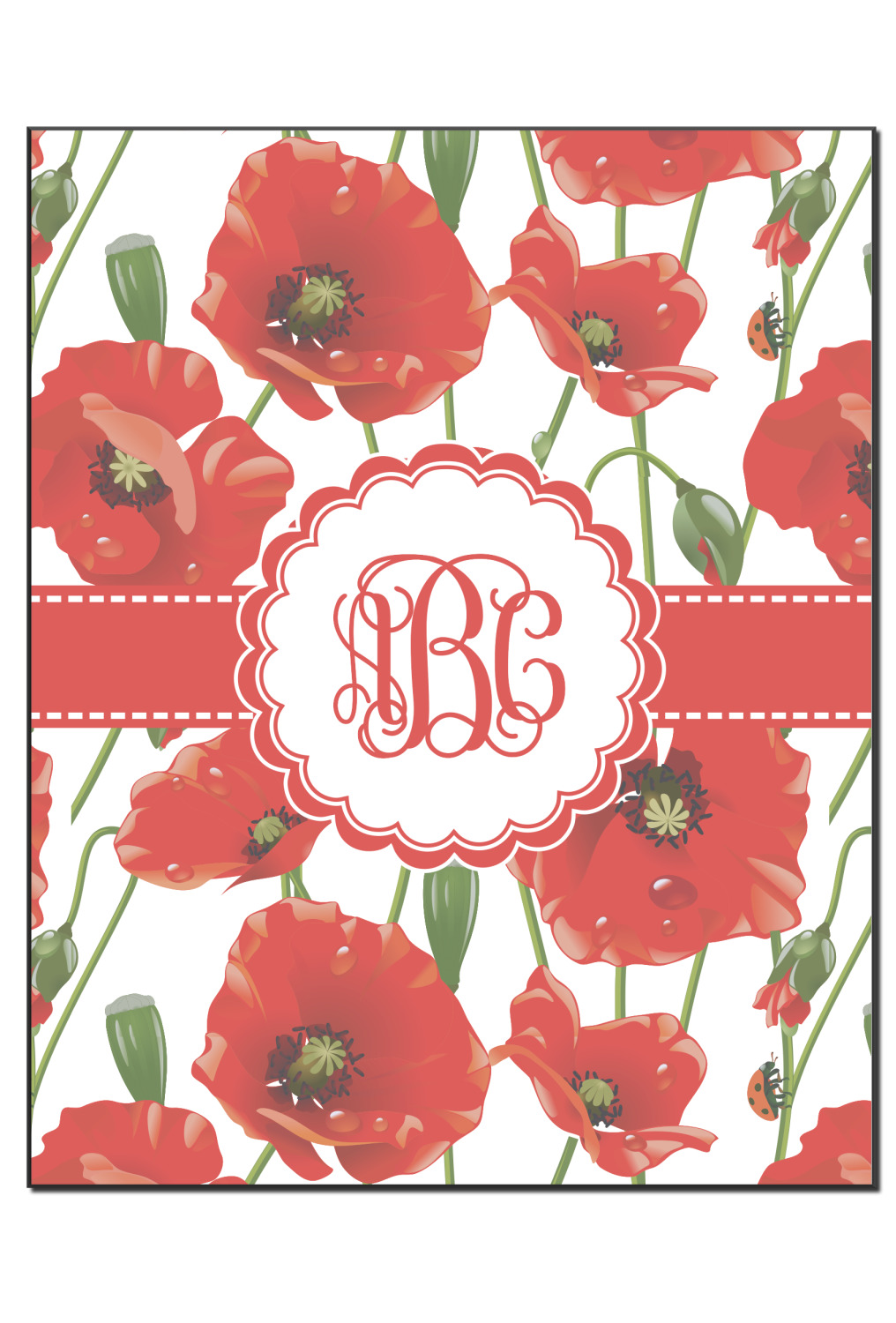 A scalloped label rests in the center of the poppy field, the perfect place for the personalization of your choice.
