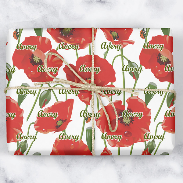 A scalloped label rests in the center of the poppy field, the perfect place for the personalization of your choice.