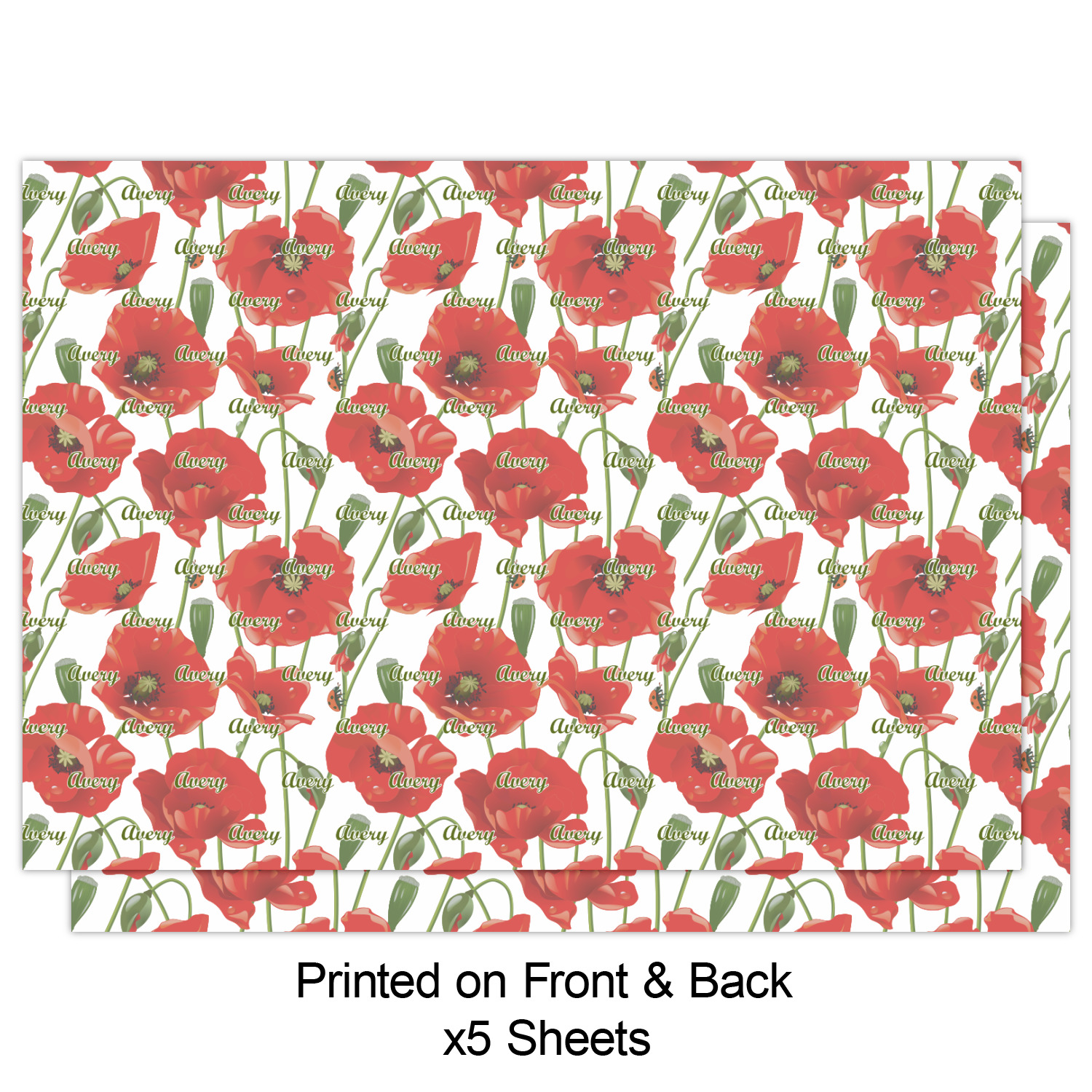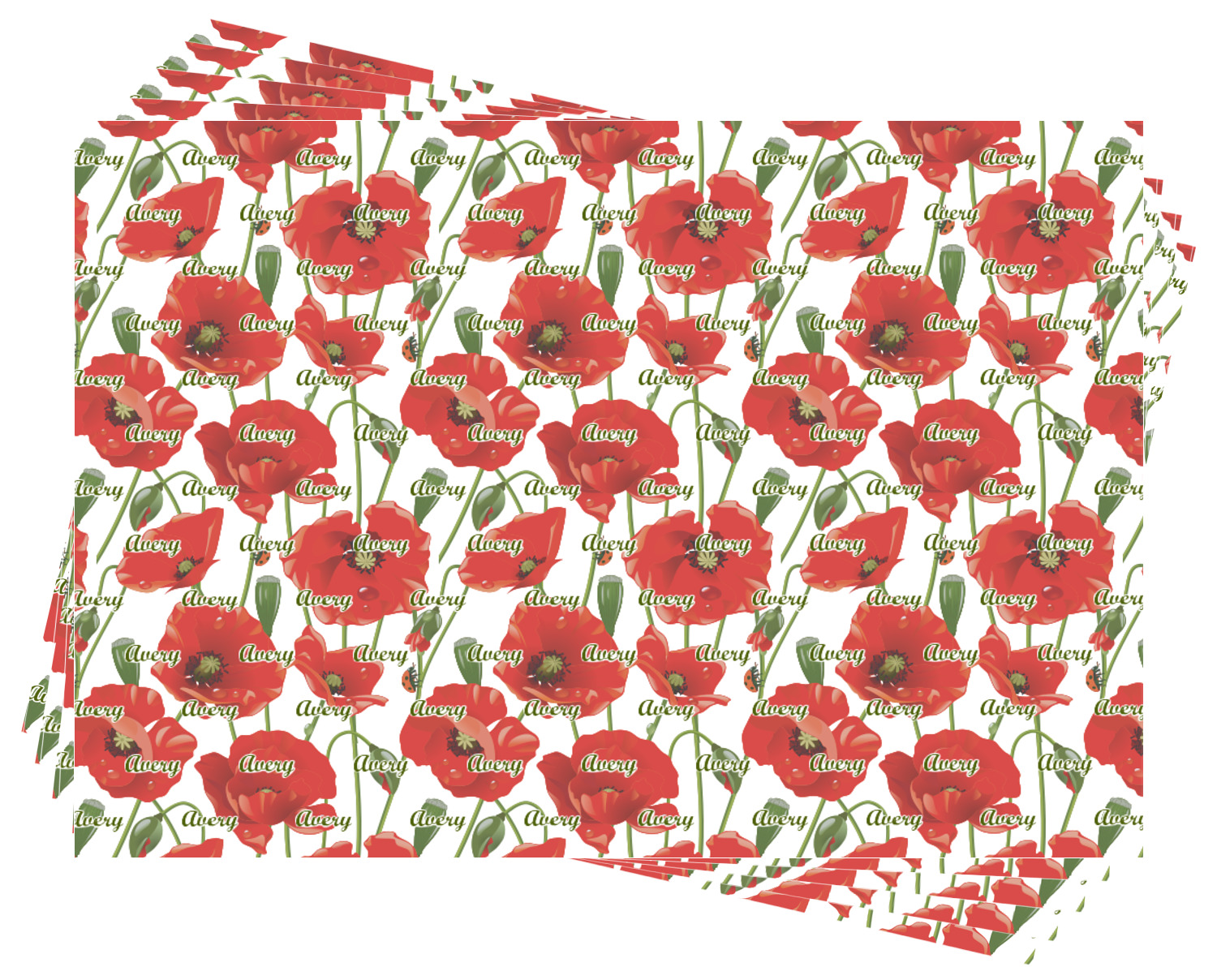 A scalloped label rests in the center of the poppy field, the perfect place for the personalization of your choice.