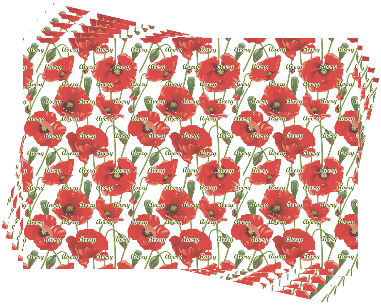 A scalloped label rests in the center of the poppy field, the perfect place for the personalization of your choice.
