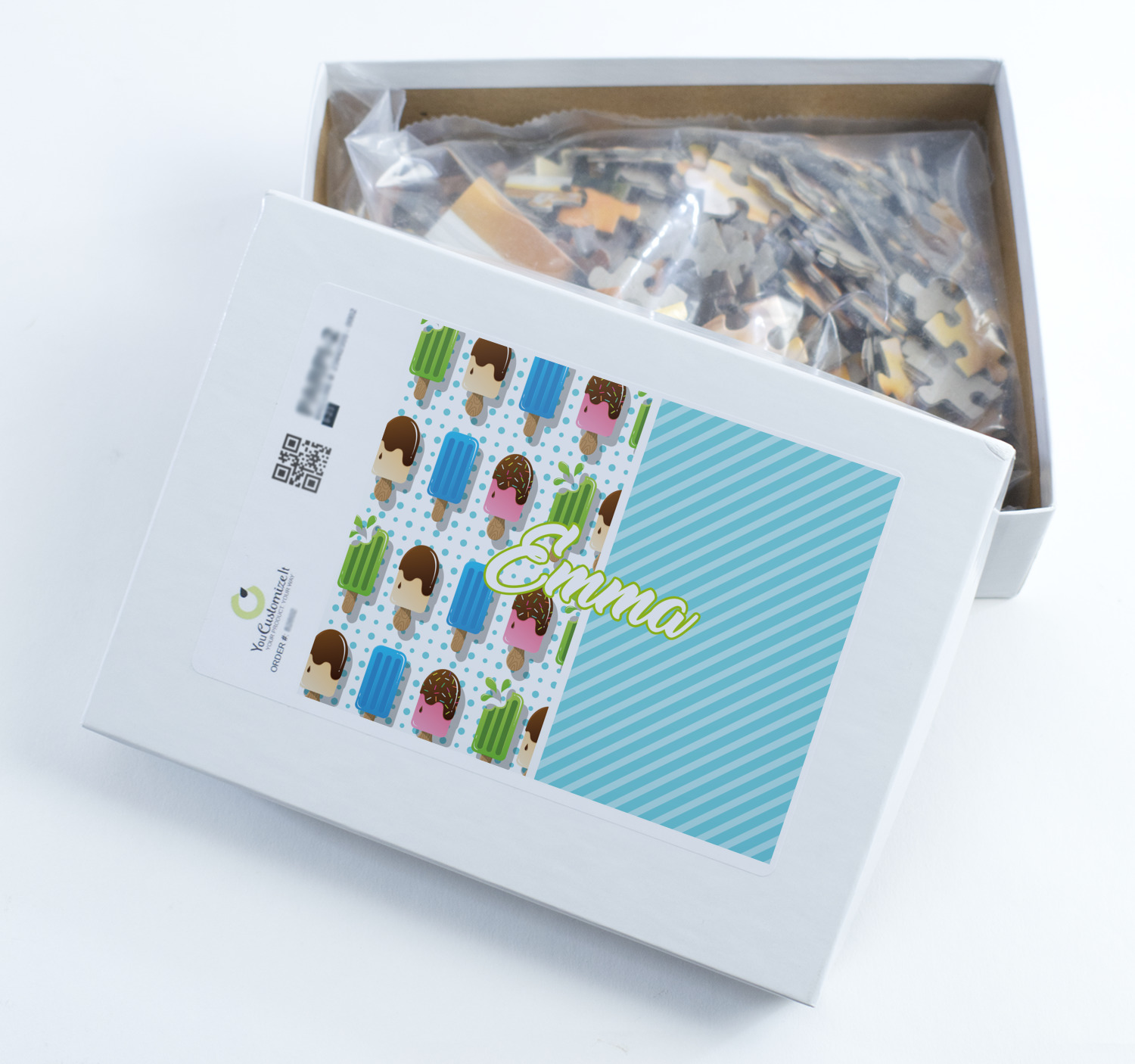 We print our puzzles on thick white chipboard in vibrant colors, then laminate the chipboard and die cut your puzzle. Your jigsaw puzzle is shipped to you in a box with the image of the puzzle on the box.