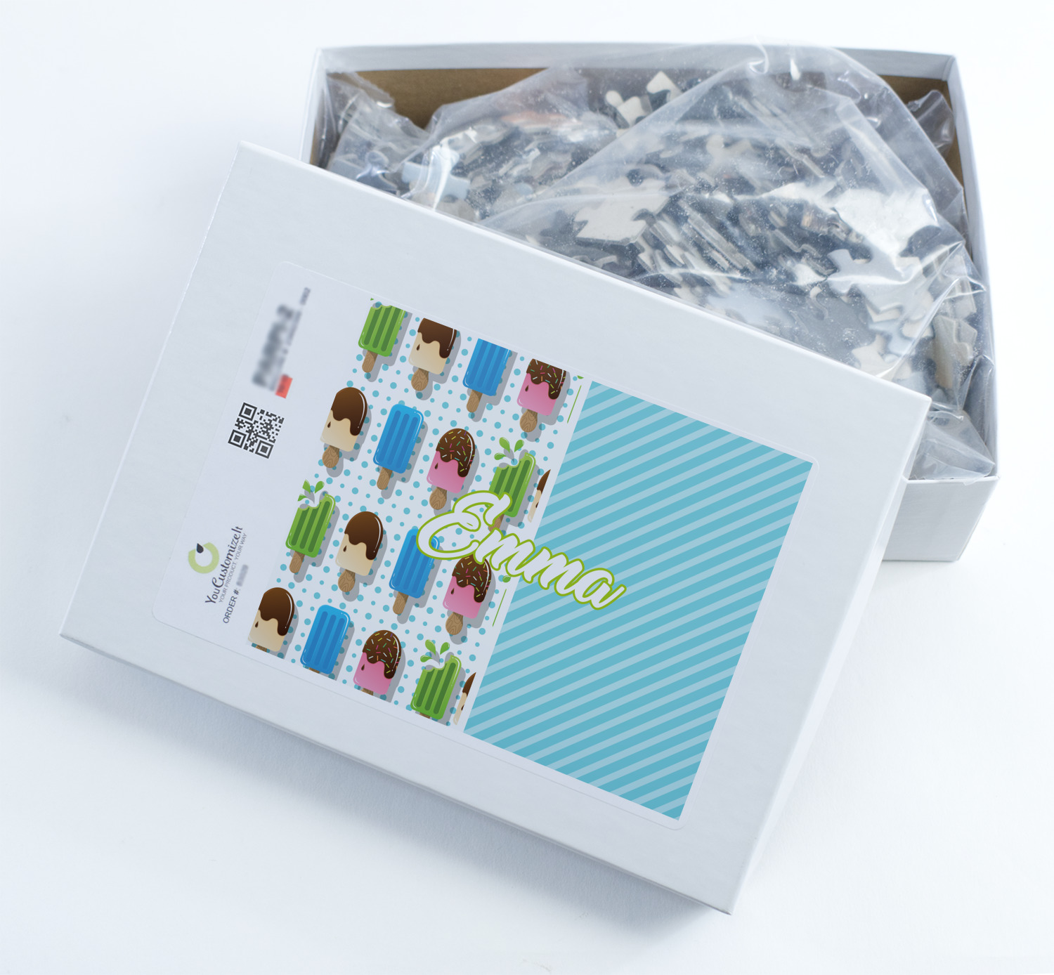 We print our puzzles on thick white chipboard in vibrant colors, then laminate the chipboard and die cut your puzzle. Your jigsaw puzzle is shipped to you in a box with the image of the puzzle on the box.
