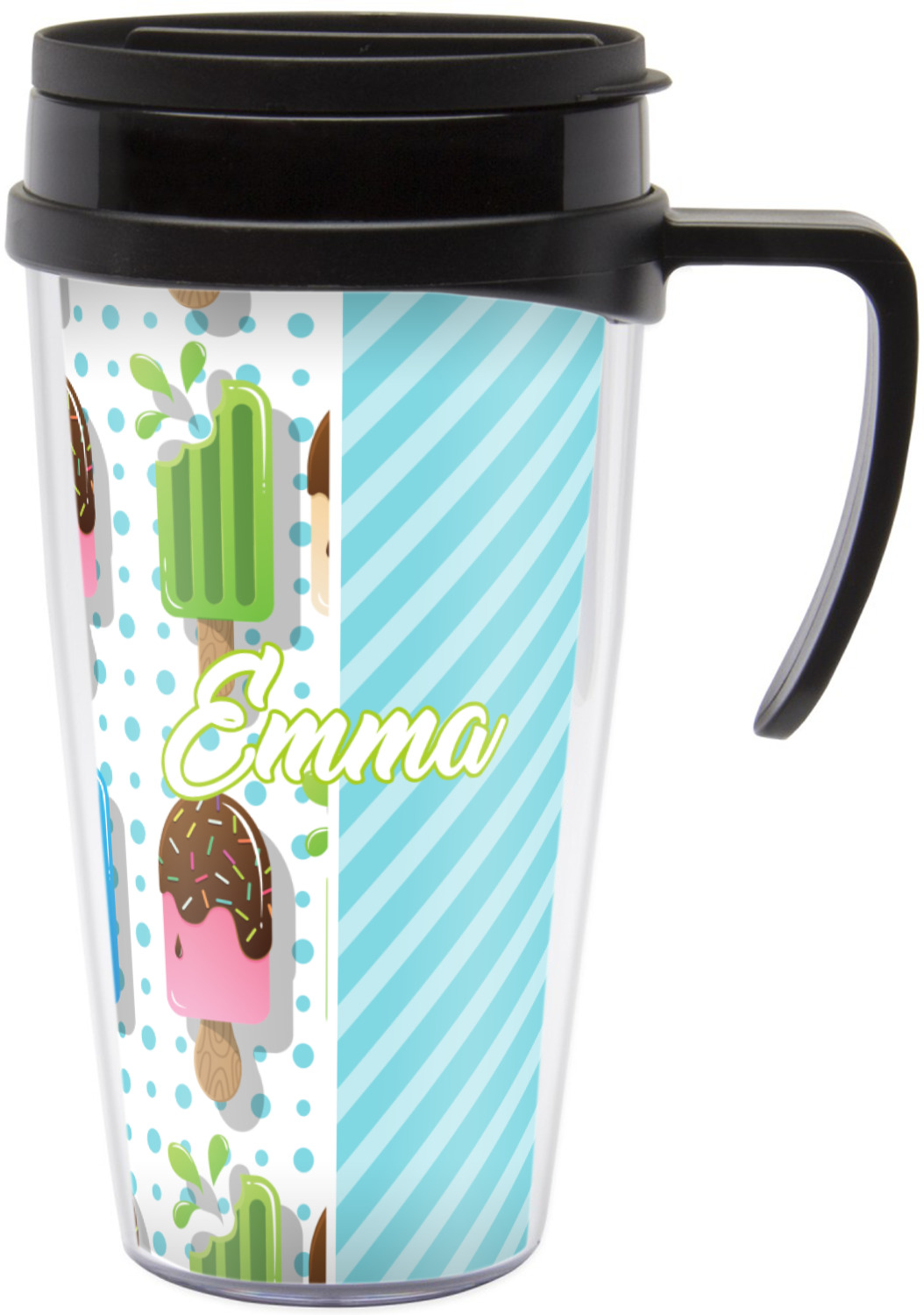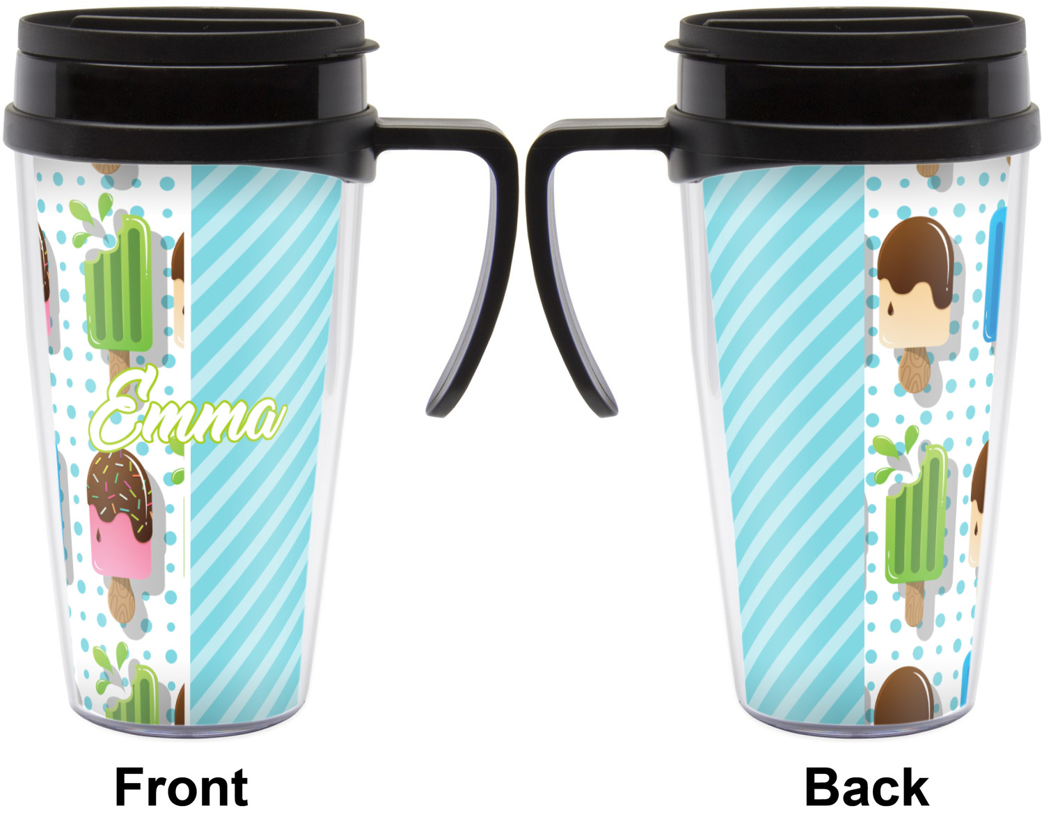 These thermal mugs are free of BPA, and insulated, to keep your drinks hot or cold. The black, snap on lid and the slider for sipping allows you to conveniently sip your drink without constantly worrying about a disastrous spill. We offer this mug with and without a handle, to better suit your needs. Each custom thermal mug holds up to 16 ounces of liquid and displays your customization on all sides on premium gloss media inserts.