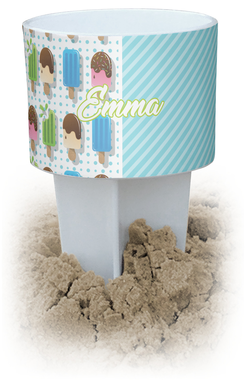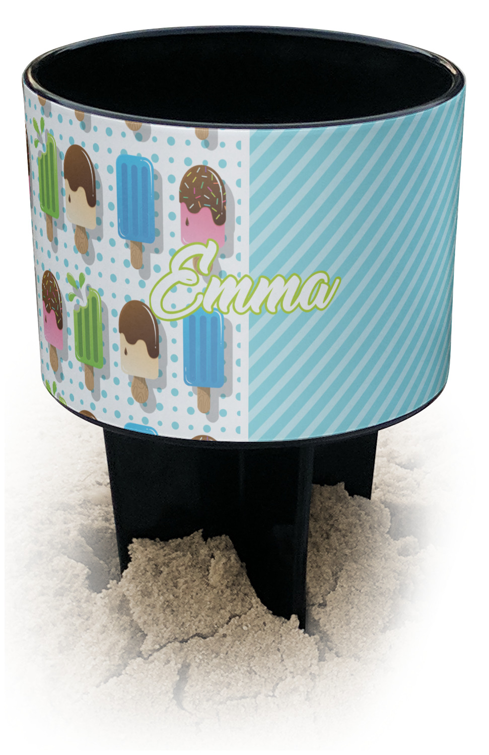 This cup holder has a large stake at its bottom that anchors it to the sand or ground below, while the cup holder rests above the stake. The entire drink holder is made of durable plastic and displays your customization around the cup holder portion. We sell these personalized beach spikers in two different colors: black and white.
