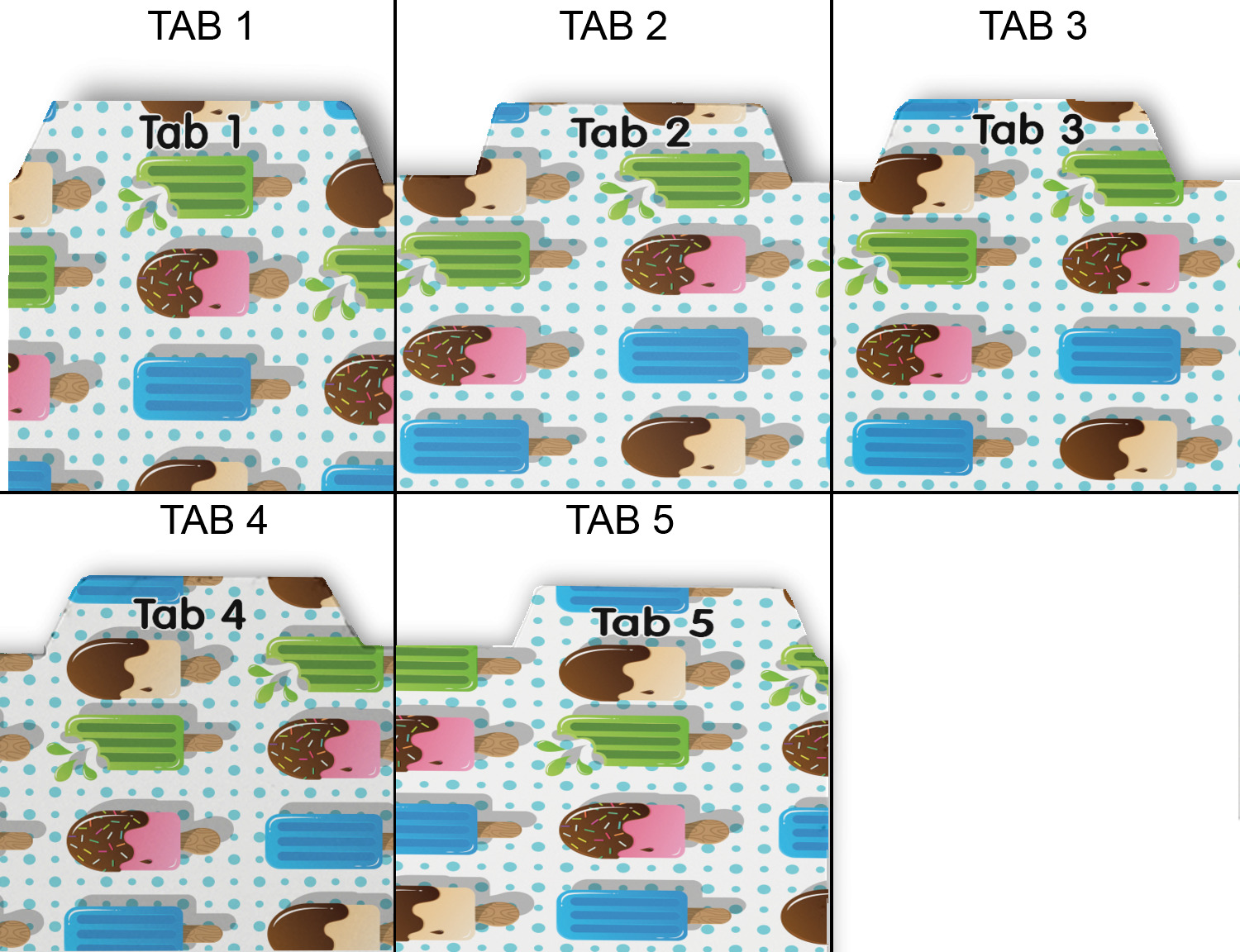 Whether you use binders at school or at work, we have designs to suit all of them. Available in 5 or 6 tab sets, you are sure to find a set to suit your needs. The back of each one is white and can be used to take notes, write vital information on, etc.