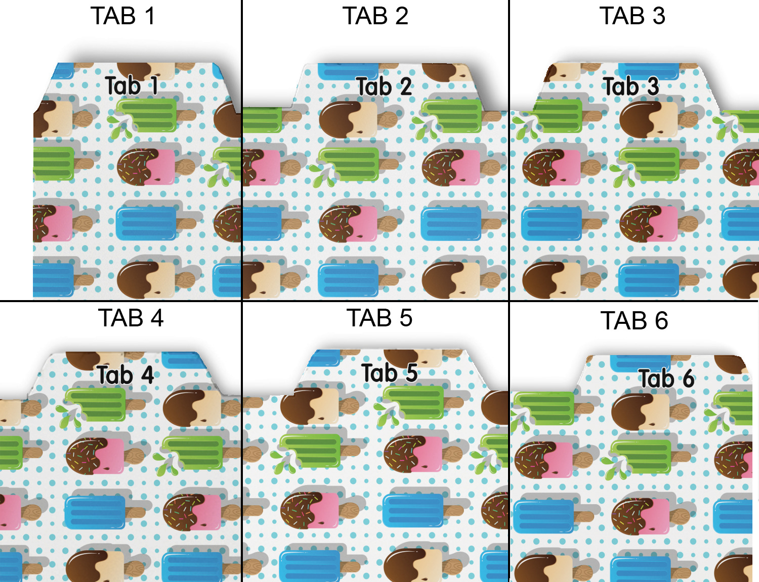 Whether you use binders at school or at work, we have designs to suit all of them. Available in 5 or 6 tab sets, you are sure to find a set to suit your needs. The back of each one is white and can be used to take notes, write vital information on, etc.