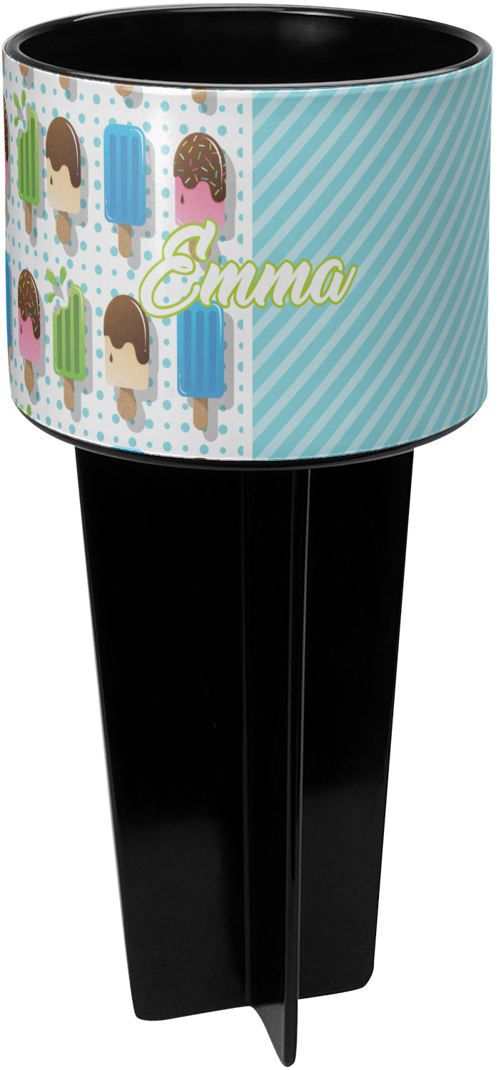 This cup holder has a large stake at its bottom that anchors it to the sand or ground below, while the cup holder rests above the stake. The entire drink holder is made of durable plastic and displays your customization around the cup holder portion. We sell these personalized beach spikers in two different colors: black and white.