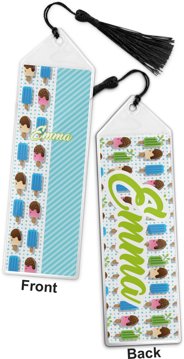 Your personalized bookmark is made of a sturdy, clear vinyl, and is approximately 7.5" x 2.25". We display your personalization on vinyl inserts that are placed on both sides. Accompanying each book marker is a black, fringe tassel that attaches to the reinforced, triangular header.