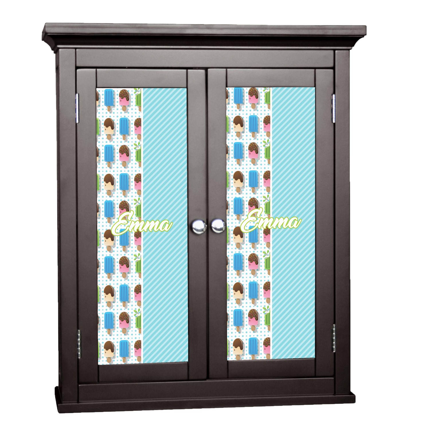 This design is a fun light teal, with pops of lime green and other bright colors. This design is split right down the middle so that you can have two fun patterns on either side The left half are four different kinds of popsicles that repeat in this cute design, with teal polka dots sitting behind them. On the other half is your fun slanted teal stripes pattern.
