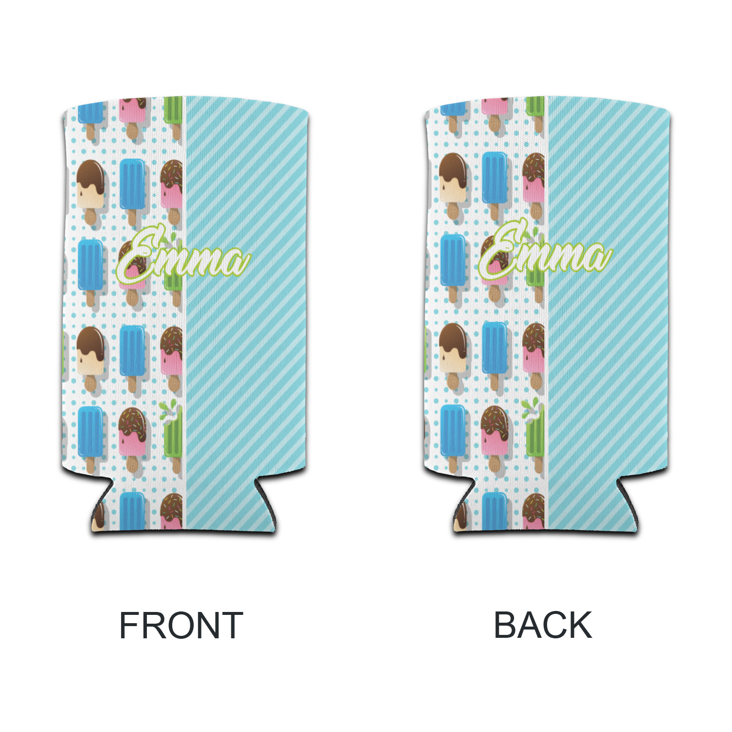 This design is a fun light teal, with pops of lime green and other bright colors. This design is split right down the middle so that you can have two fun patterns on either side The left half are four different kinds of popsicles that repeat in this cute design, with teal polka dots sitting behind them. On the other half is your fun slanted teal stripes pattern.