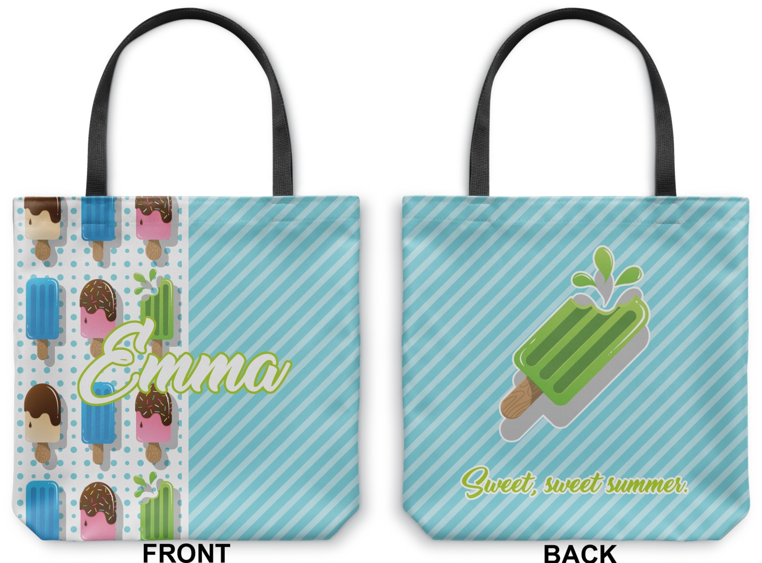 Our totes are made right here in the USA. Your design is printed on canvas fabric; the fabric is then cut and sewn on the sides and on the bottom to add an approximately 3.5 inch gusset. Black cotton handles are sewn in and reinforced. Your tote has a designs on both sides - the designs can be the same or different - the choice is yours. The inside of the tote has a black fused lining.