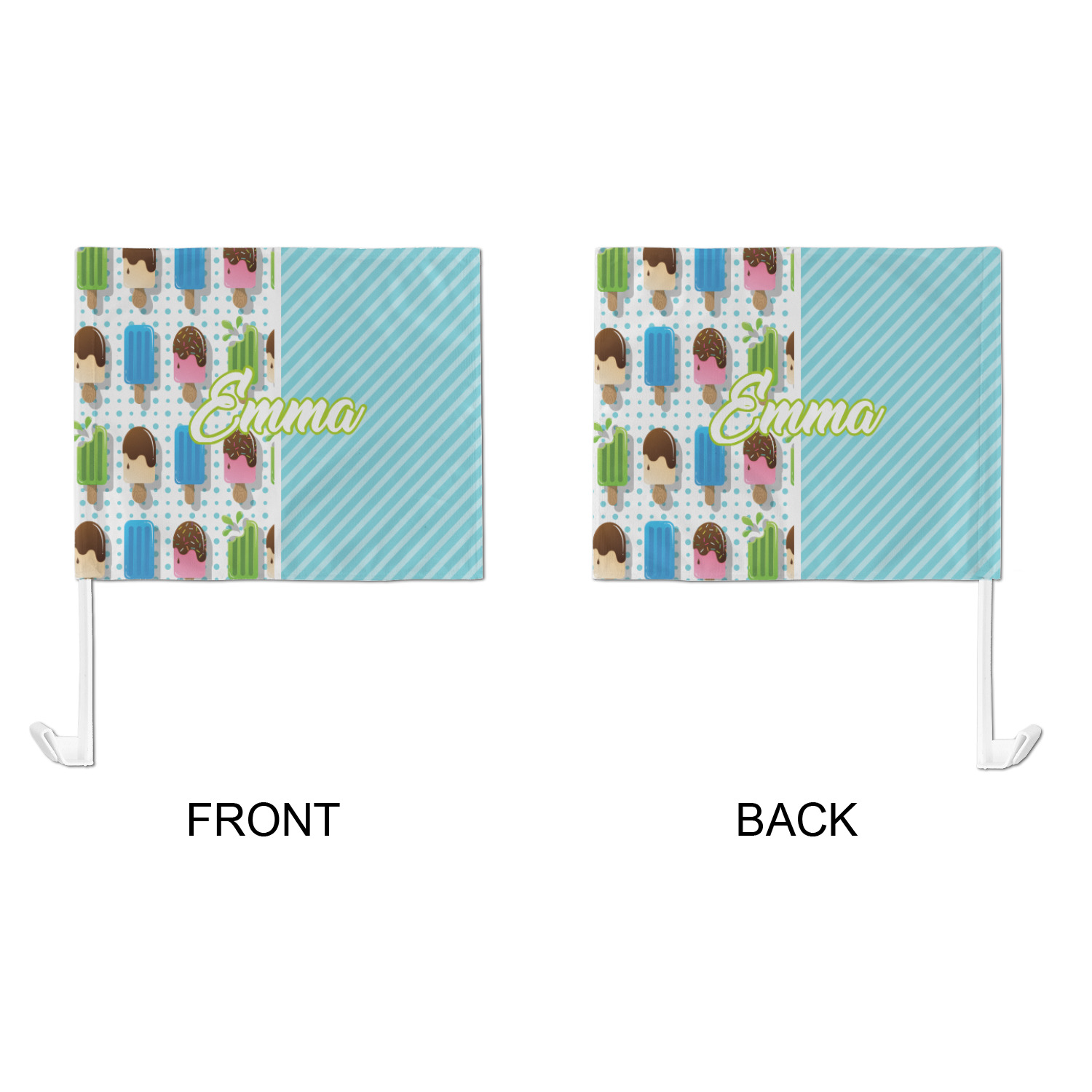 Our personalized flags are made from a durable, yet lightweight cloth that will proudly bear your logo or design of choice, while withstanding the outside elements. We have two size options - 8" x 11" and 11" x 15". Both come with a flag pole which includes a clip that secures the pole to the side window, whether it is rolled up or down. The flags are printed on both sides to display your design from all directions.