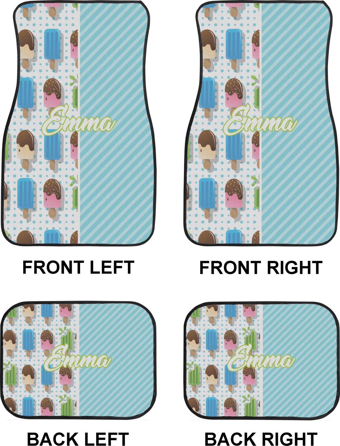 We craft our auto floor mats mats from polyester, apply a black finish to the edges, and lined at the bottom to prevent slippage. These mats protect your floors from grass, mud, and any accidental spills. We display your personalized design on the front face of each mat. The sizes of these car floor liners are standardized to provide a versatile fit for all vehicles. The front rows car mats measure at 17 by 26.5 inches, while the back rows measure at 17 by 13 inches. We sell three packages of car floor mats. You can purchase a pair of front row car mats, a pair of back row car mats, or a set of front row and back row car mats. To make an informed purchase, we recommend measuring the surface area of your car floors.