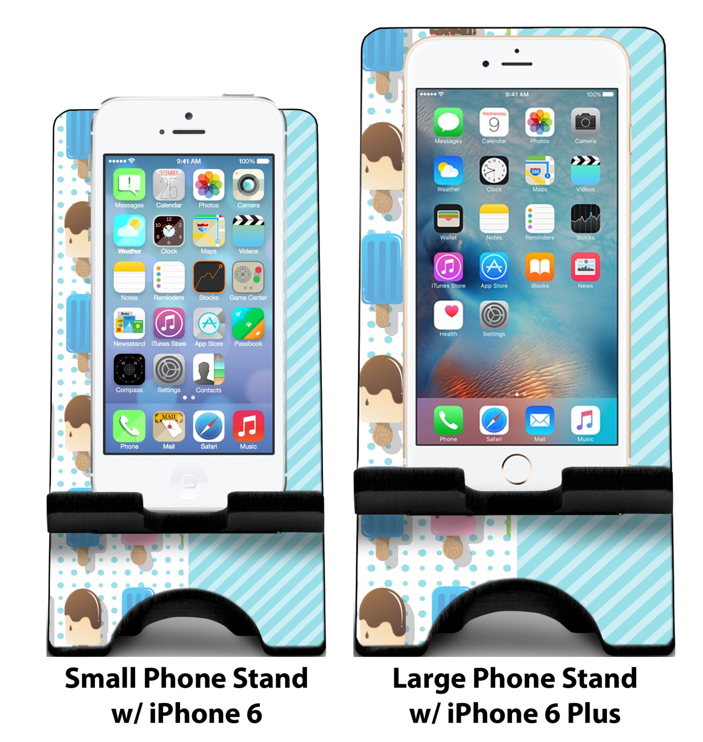 To meet your needs, we offer four variations of this IPhone stand. The backboard of the first version is shaped as a plain, yet sleek rectangle, and is available in two sizes. Our smaller size is approximately 4 by 3.25 by 7 inches, while the larger model is 4 by 3.77 by 8.5 inches. Alongside this model, we also provide you with a more decorative option. The upper part of our second version features a curved edge, for a classy, suave appearance. This phone holder is also sold in two sizes: a smaller version, which is 4 by 3.25 by 7 inches, and our larger model, which is 4 by 3.77 by 8.5 inches. Both models will support large phones, but the larger model is better if you wish to proudly display your personalized design.