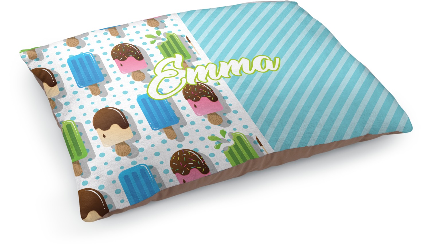 This design is a fun light teal, with pops of lime green and other bright colors. This design is split right down the middle so that you can have two fun patterns on either side The left half are four different kinds of popsicles that repeat in this cute design, with teal polka dots sitting behind them. On the other half is your fun slanted teal stripes pattern.