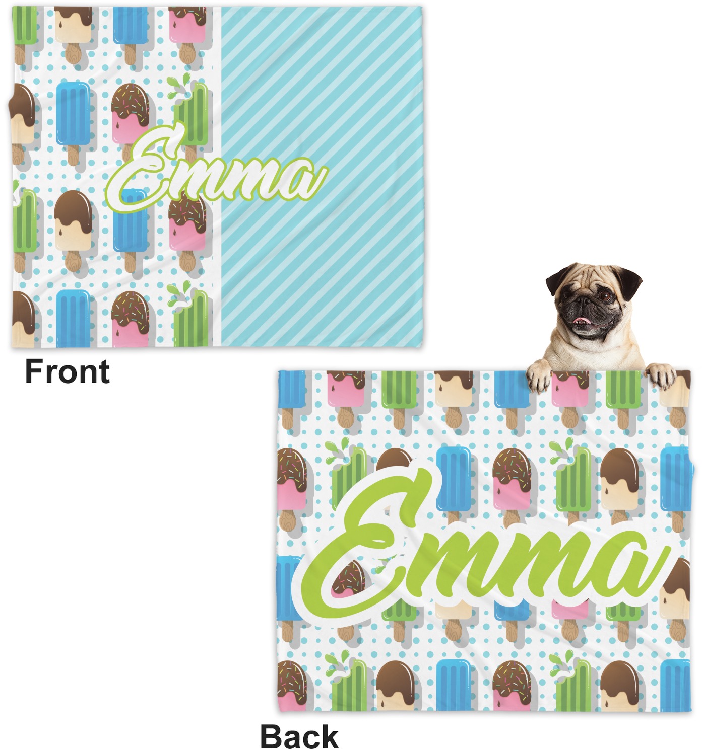 These dog blankets are crafted from a gentle, soft-to-the-touch, minky material. We print your customizations, either matching or differing, on both the top and underside of the blanket. These personalized dog blankets are available in two sizes: regular and large. Our regular size, at 40" x 30", accommodates small and some medium size dogs. At 60" x 50", our large dog blanket is a better fit for bigger breeds. Though specialized for dogs, these blankets still make a thoughtful gift for your favorite feline, or any other pet in mind!