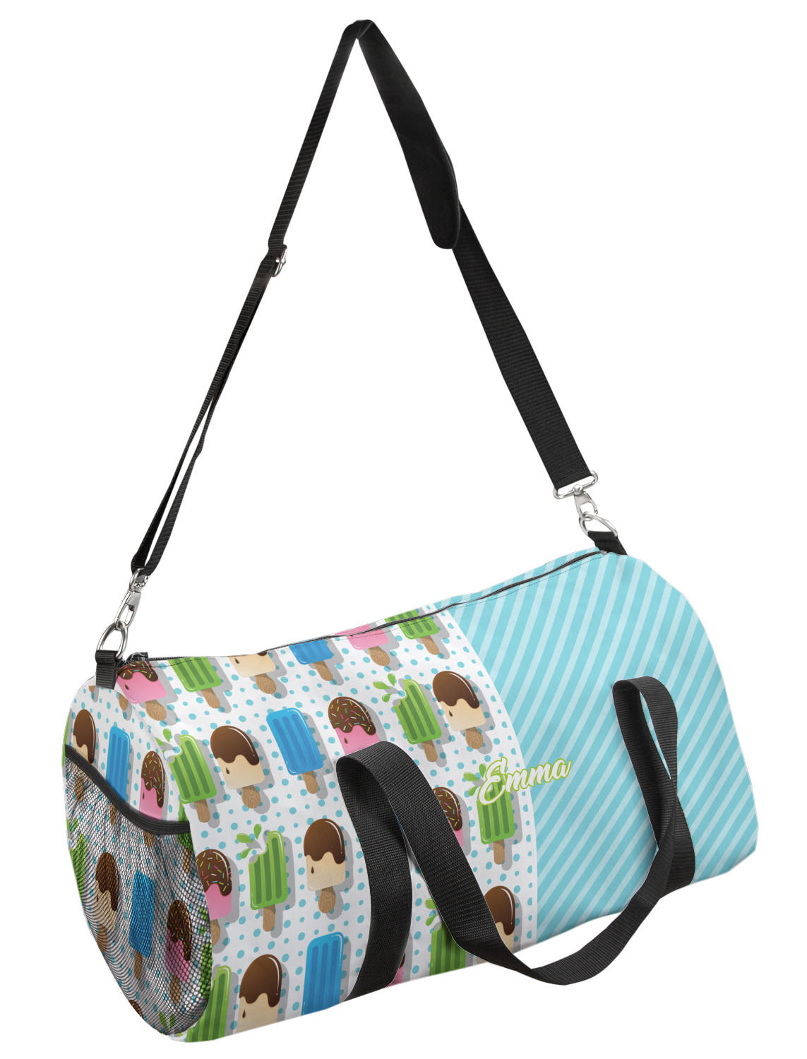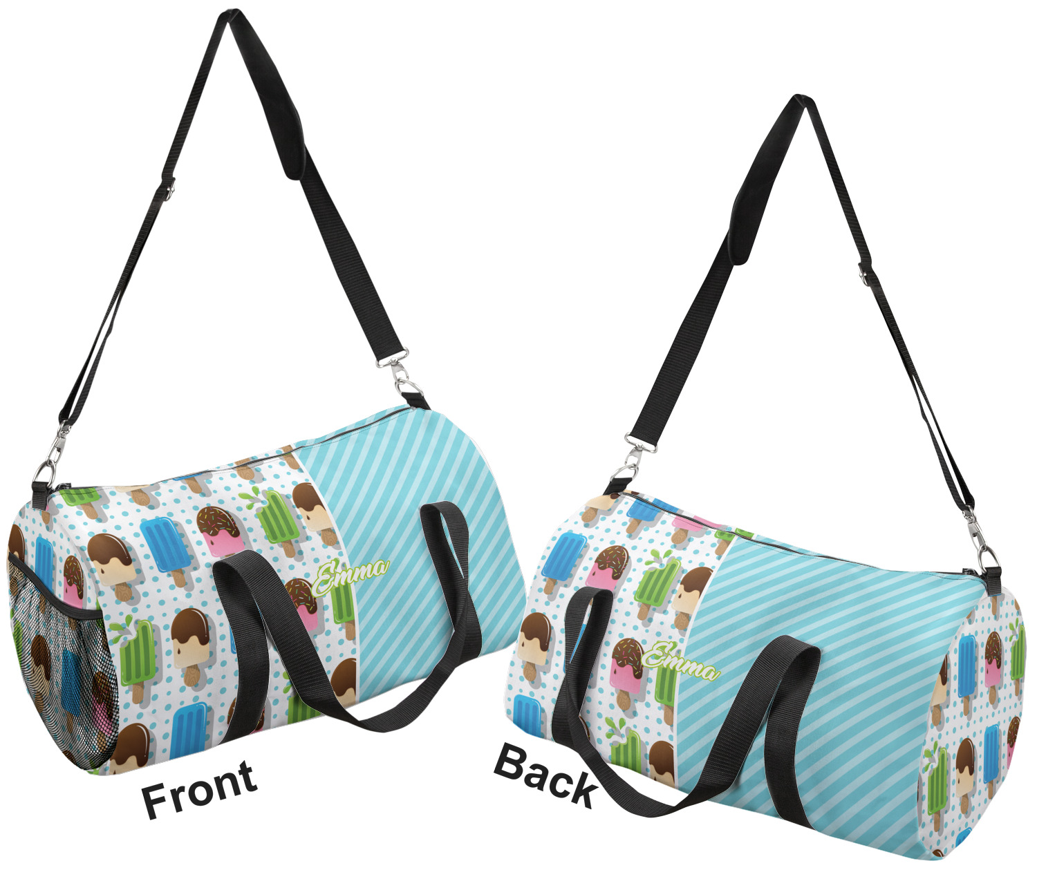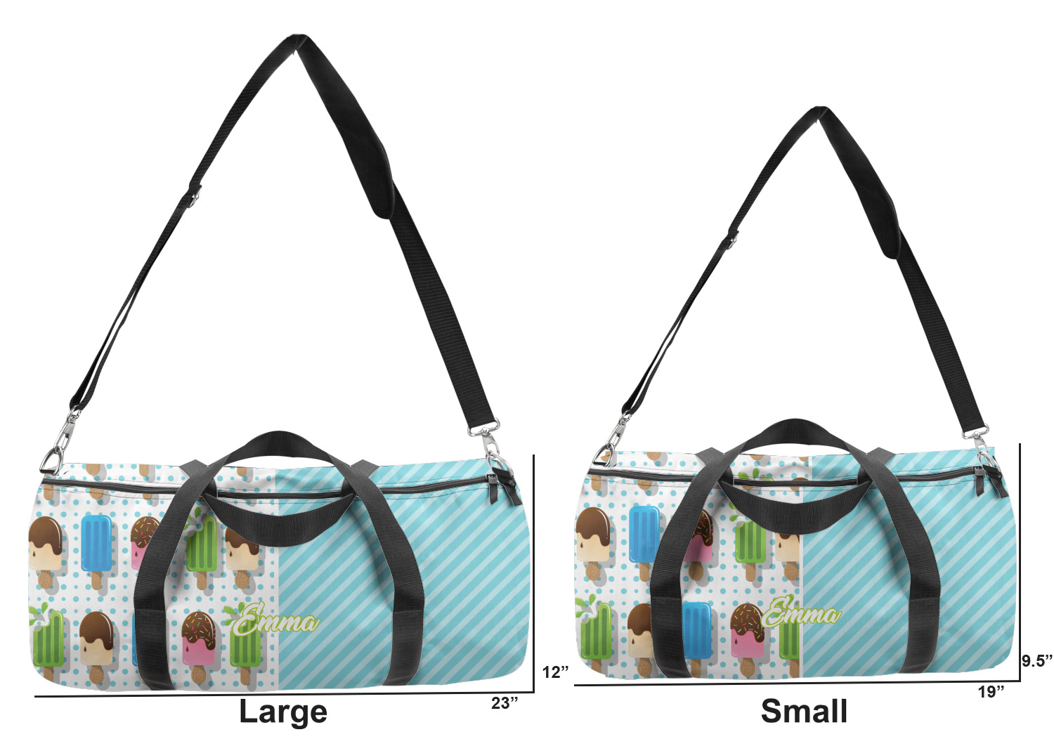 This duffle is a sturdy bag made of a canvas material. It comes in two sizes: Small (19"W x 9.5"H x 9.5"D) and Large (23"W x 12"H x 12"D). The bag is a cylindrical shape with a black adjustable strap and two handles. On one side is an elastic pouch to put a waterbottle or other small item. Your product will be sublimated with your design and is able to be designed on the front, back, and sides. Be sure to remember that the straps may cut into parts of your design if you upload your own artwork.