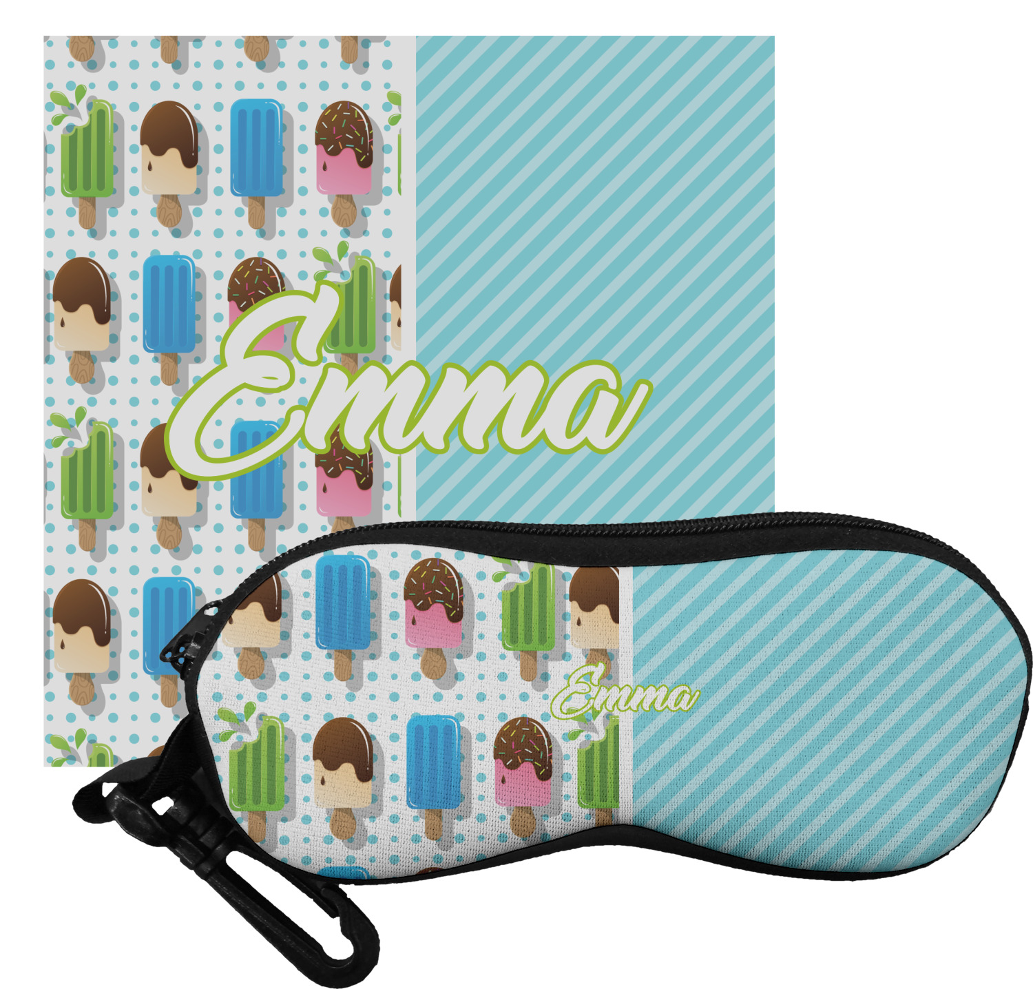This design is a fun light teal, with pops of lime green and other bright colors. This design is split right down the middle so that you can have two fun patterns on either side The left half are four different kinds of popsicles that repeat in this cute design, with teal polka dots sitting behind them. On the other half is your fun slanted teal stripes pattern.