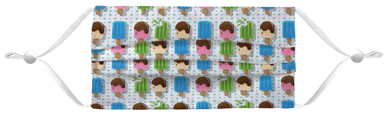 These fun face masks are 7" wide and 3.5" high. They feature pleats, adjustable ear loops, and are made with two layers of fabric. The top layer where your design is printed is a breathable polyester sheeting, while the inside layer is a soft microfiber polyester