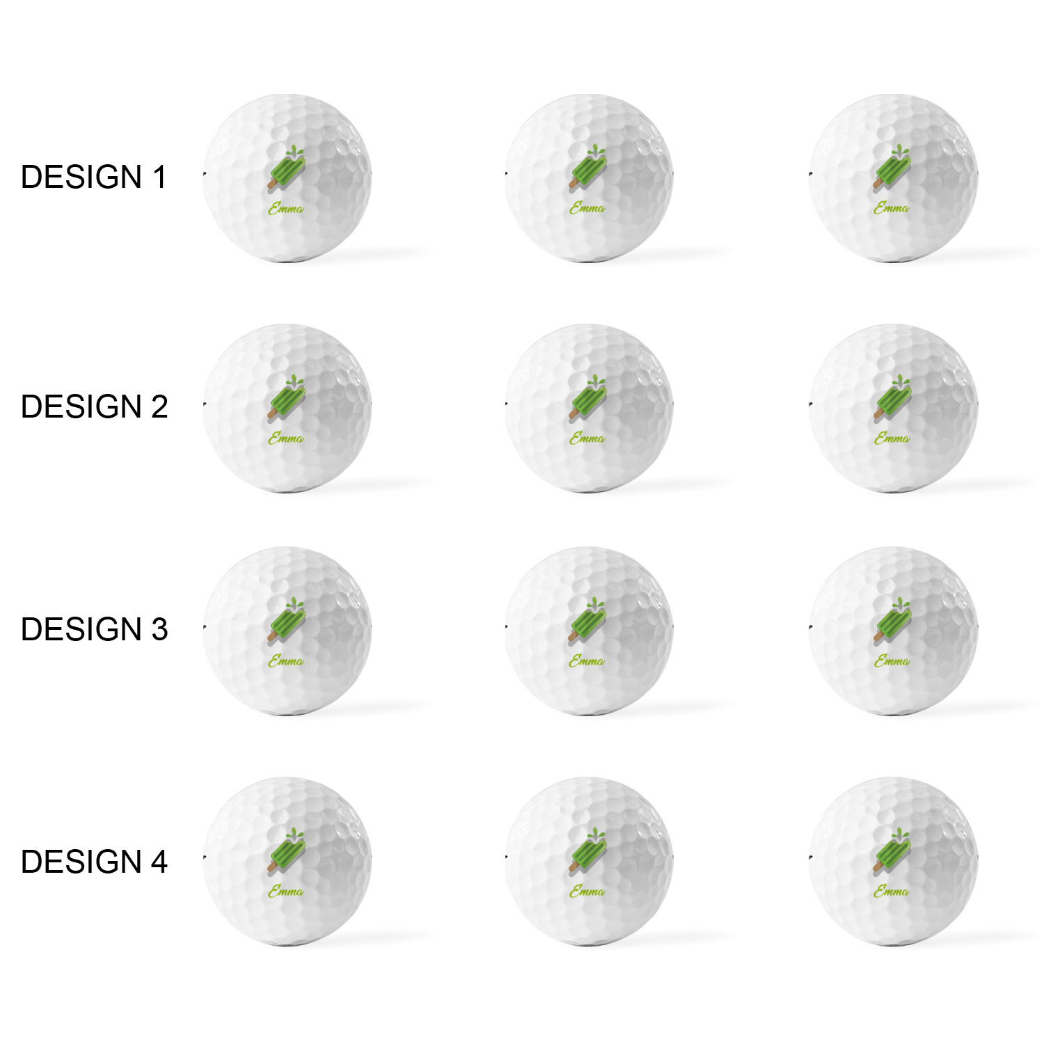 Printed in a 7/8" circle on each ball, you can customize these with our design studio or use your own designs. For a set of 3 you can design each one individually, for a set of 12 you will be able to use 4 unique designs and will receive 3 balls with each design.