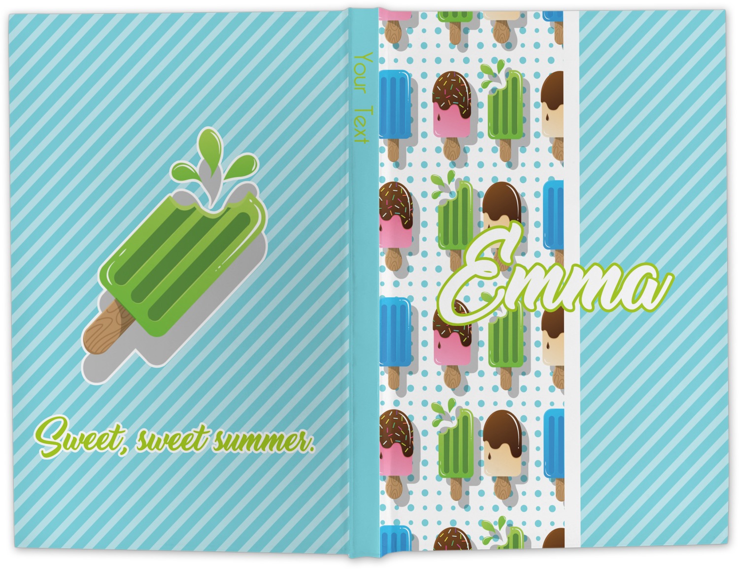This design is a fun light teal, with pops of lime green and other bright colors. This design is split right down the middle so that you can have two fun patterns on either side The left half are four different kinds of popsicles that repeat in this cute design, with teal polka dots sitting behind them. On the other half is your fun slanted teal stripes pattern.