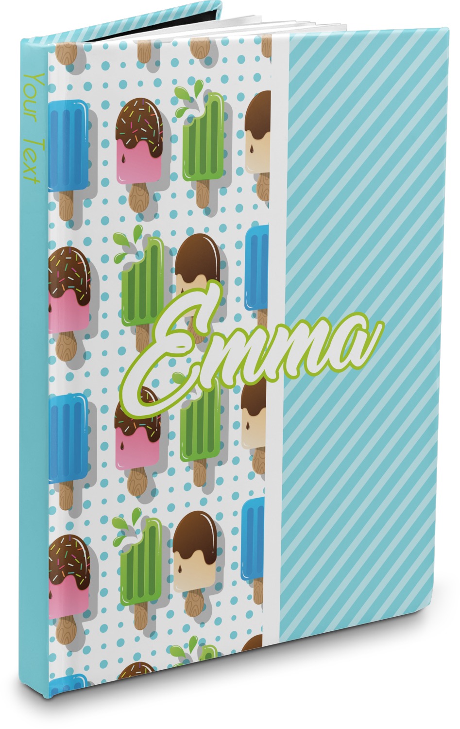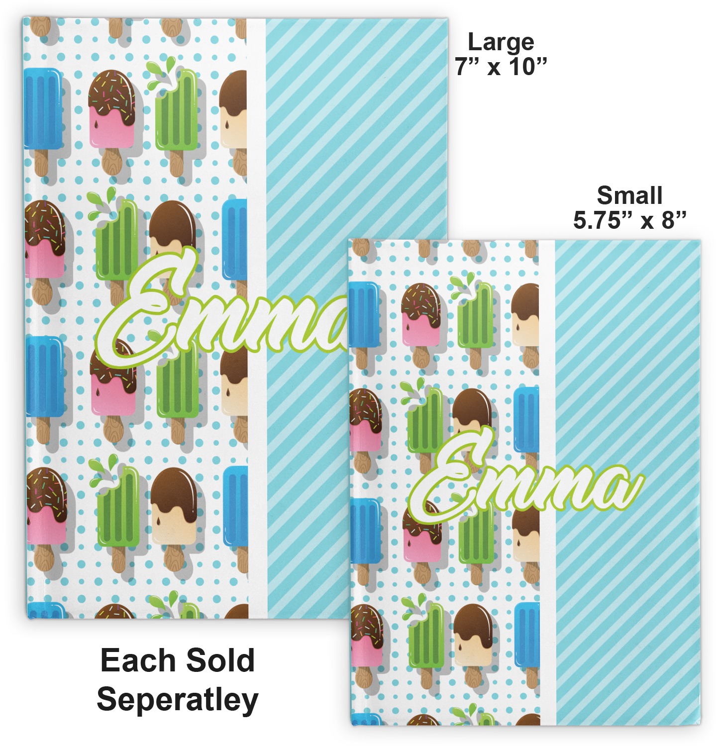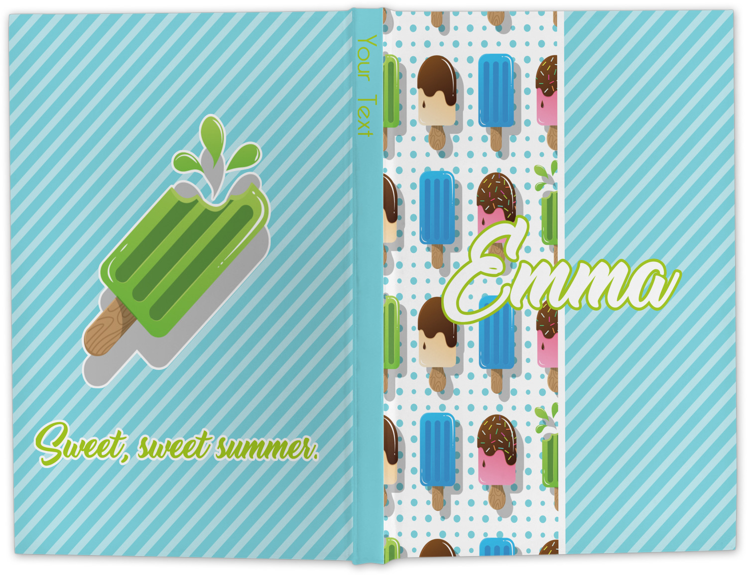 This design is a fun light teal, with pops of lime green and other bright colors. This design is split right down the middle so that you can have two fun patterns on either side The left half are four different kinds of popsicles that repeat in this cute design, with teal polka dots sitting behind them. On the other half is your fun slanted teal stripes pattern.