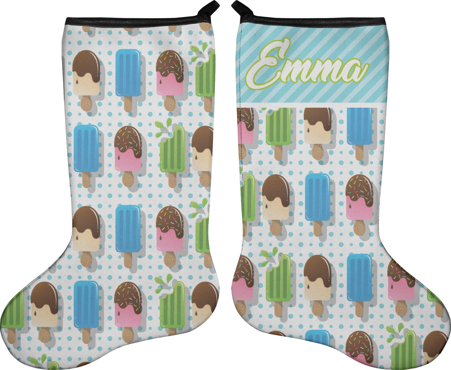 These 17" x 11" stockings are made of neoprene and have a black trim to give them a fantastic finished look. Your very own design is printed right onto the stocking, either single sided with white on the back or double sided where can use the same or different designs / patterns on the front and the back - the choice is yours. At the top of the stocking is a 2" loop for hanging.