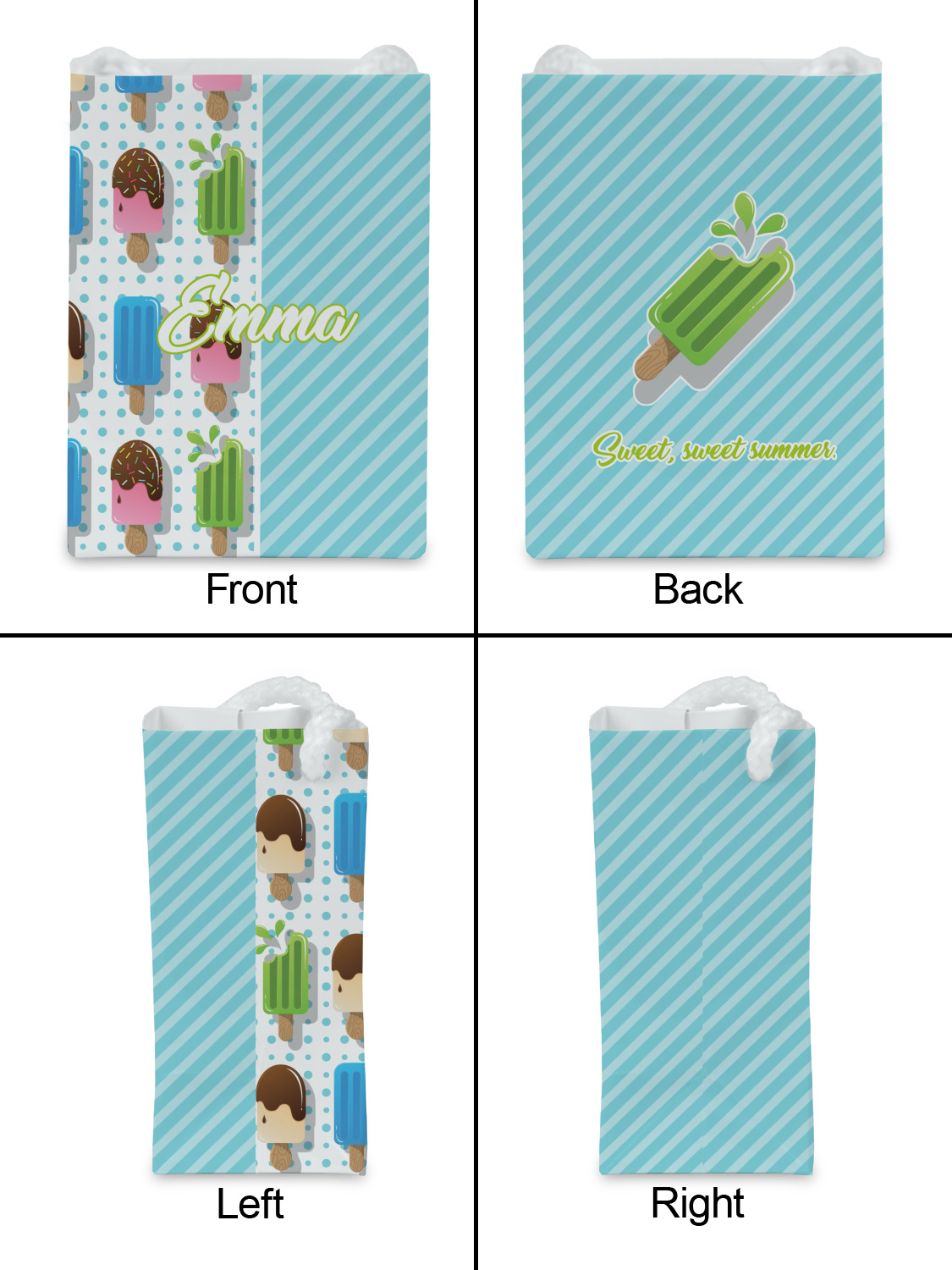 These jewelry gift bags are available in two finishes - matte or gloss. The are digitally printed in full color, then cut down to size, scored & folded. A single handle is attached.