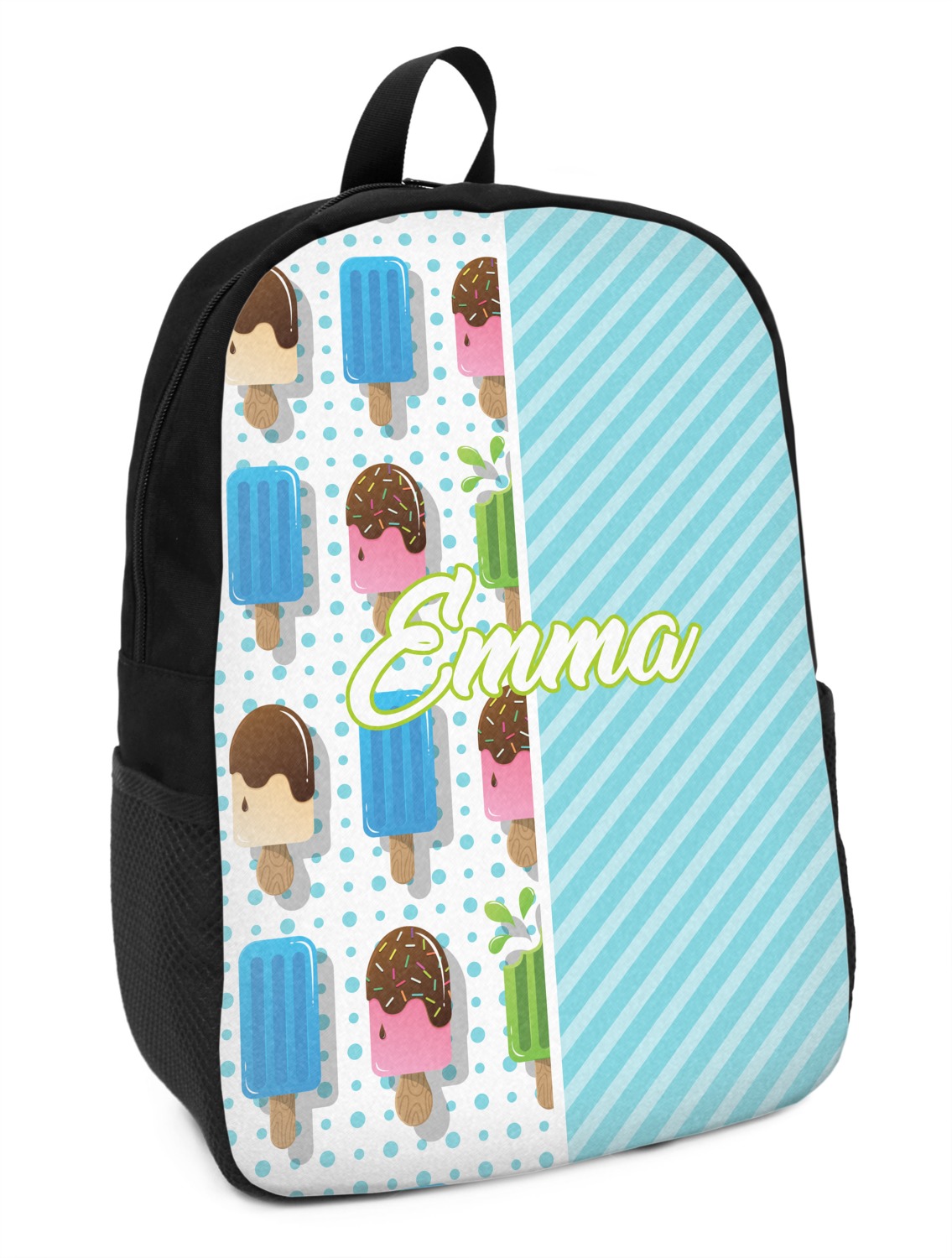 These small backpacks are made of a durable black canvas material with your personalization right on the front. The two shoulder straps are padded and easily adjustable. The bag itself measures at about 11" W x 15" H x 5" D. It's the perfect size for elementary aged kids or adults who want a smaller backpack. On the top of the bag you will find a handle to hang or carry your backpack by as well as a large zipper closure to keep all of your belongings safe inside. On each side of your backpack is a mesh pocket for a small item or water bottle. Inside your backpack you will find a spacious area with a small zipper pocket and a padded laptop slot that will fit up to a 13" laptop (13" being very snug). This is the perfect bag for any student that needs a couple books and their laptop with them at all times. It also works great as a carry on for traveling!