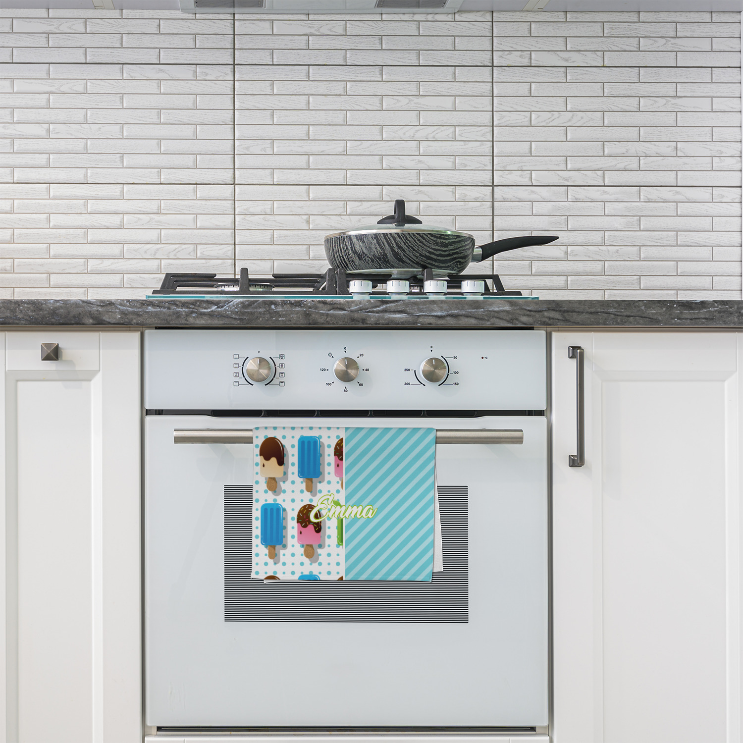 This design is a fun light teal, with pops of lime green and other bright colors. This design is split right down the middle so that you can have two fun patterns on either side The left half are four different kinds of popsicles that repeat in this cute design, with teal polka dots sitting behind them. On the other half is your fun slanted teal stripes pattern.