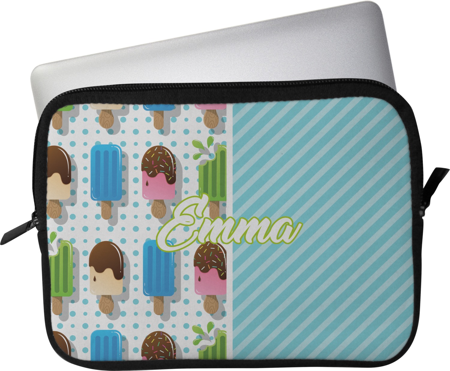 These laptop covers are built from a water-resistant, cushioned neoprene. We display your personalized design on the front of this computer sleeve, while the other sides are simply the black color of the neoprene fabric. A zipper lines the top half of this case, for direct access to your device. For added protection, the interior of this neoprene laptop sleeve is lined with a padded, minky-like material.