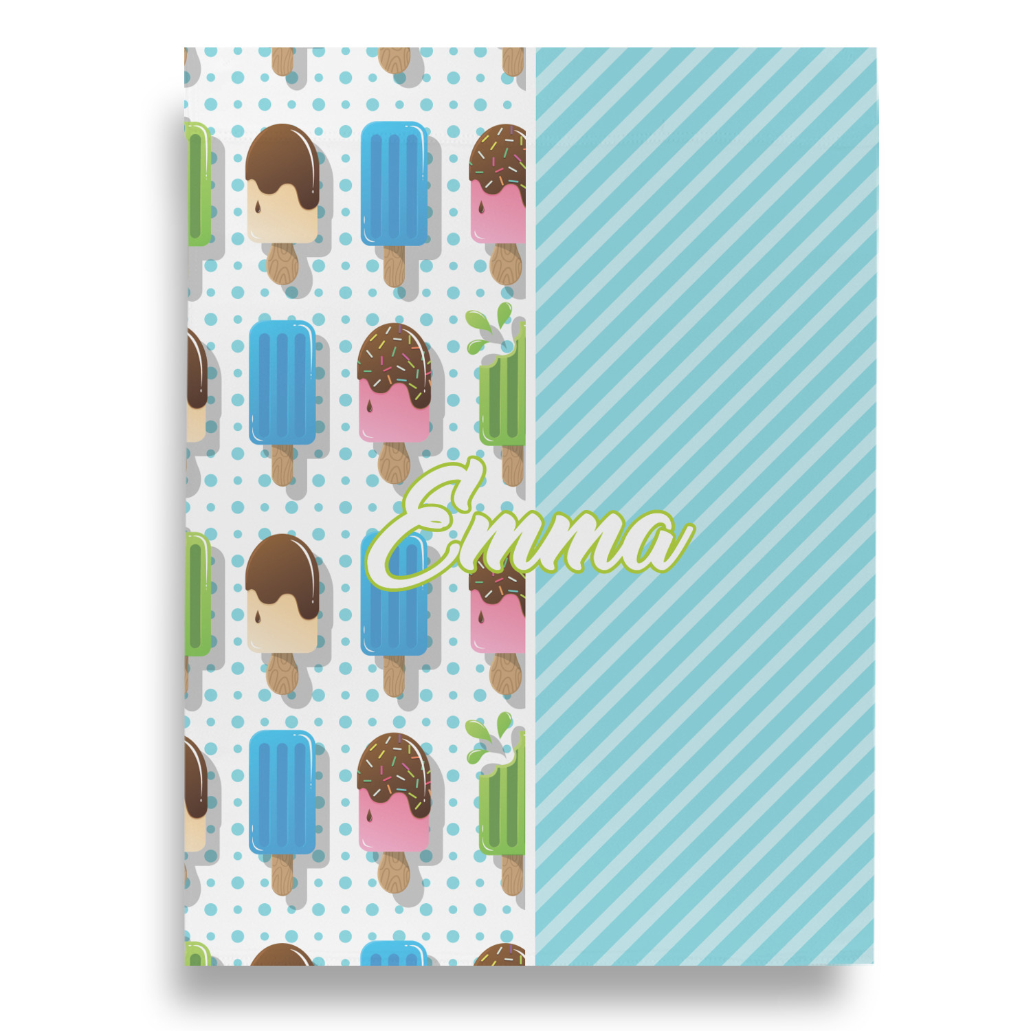 This design is a fun light teal, with pops of lime green and other bright colors. This design is split right down the middle so that you can have two fun patterns on either side The left half are four different kinds of popsicles that repeat in this cute design, with teal polka dots sitting behind them. On the other half is your fun slanted teal stripes pattern.