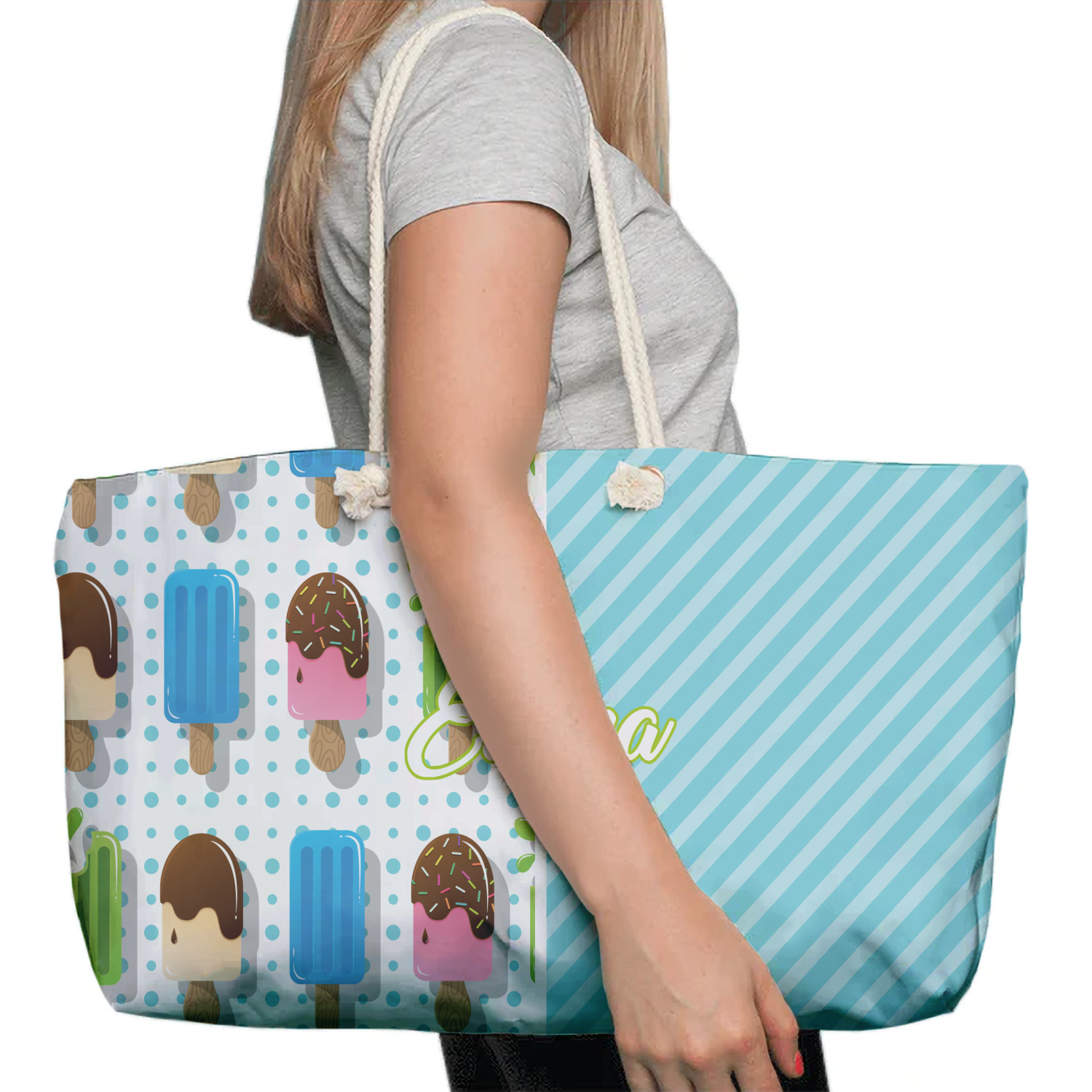 Our oversized weekender tote with rope handles is perfect for your weekend at the beach or on the town. This large tote are 24" W X 13" H, with a 5" gusset and a 27" thick rope handles with a knot that is put through a grommeted brass hole.