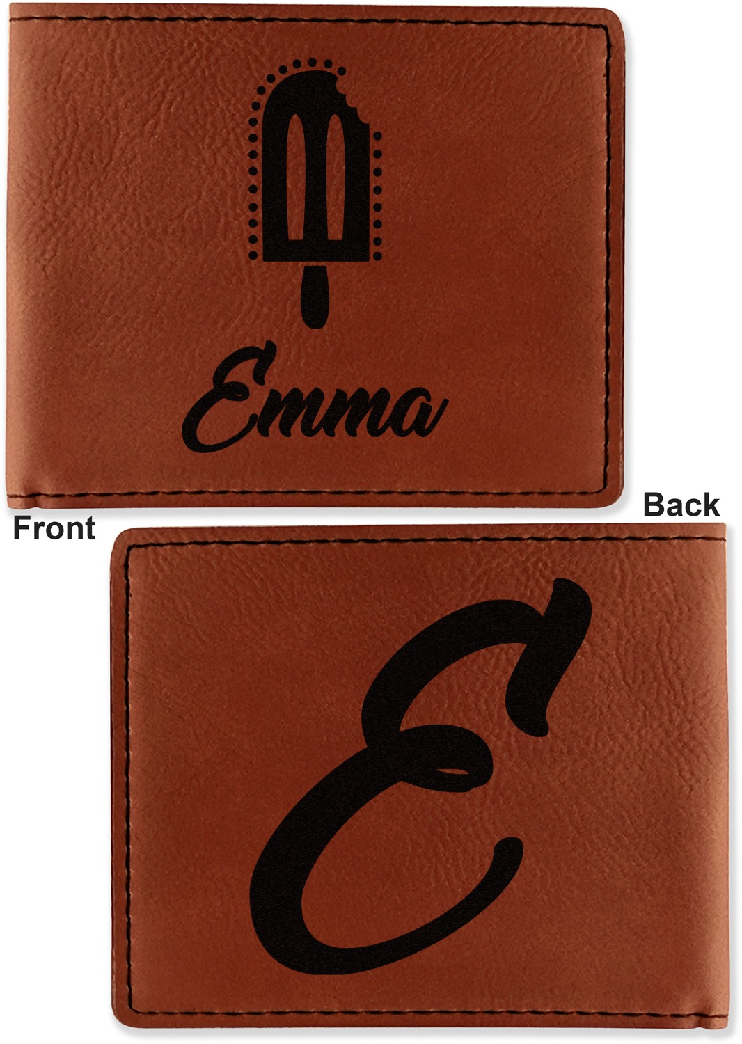 Your bifold wallet will be personalized by laser engraving, which will be a black color on the wallet. Choose a graphic, text, or monogram to personalize your wallet. There are thousands of choices in our design center.