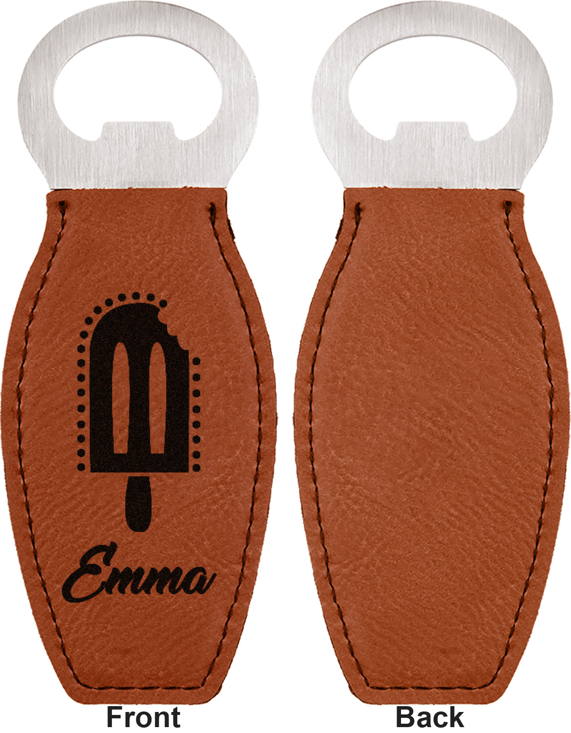 Built from stainless steel, these custom bottle openers are wrapped in a cognac-colored leatherette. Sharp, black stitching lines the edges for extra durability and a finished touch. Your personalization is laser-engraved onto the surface of this leatherette, leaving behind a crisp, black coloration. At 4.6 by 1.8 inches, this beer bottle opener gives you much of leverage when trying to open a stubborn bottle. On the opposite end of the opener, you'll find a magnet that you can use to display your new, unique bottle opener!