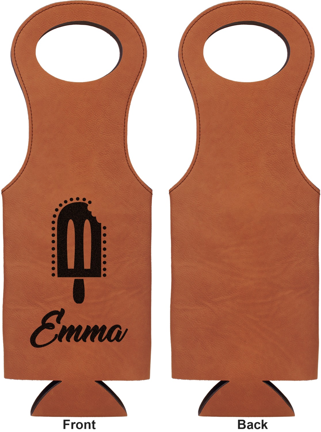 This wine carrier is made from a stunning leatherette, in a cognac-brown color. Strong, black stitching lines the sides of your wine bottle bag and provides extra durability. The interior is lined with a padded, black material to allow for a snug fit once your bottle is placed inside. At the top of this wine gift bag, you'll find two oval shaped handles that elegantly complements the rest of the bag's style. We provide you with the option of laser-engraving the front, or the front and back of your new personalized wine bag!