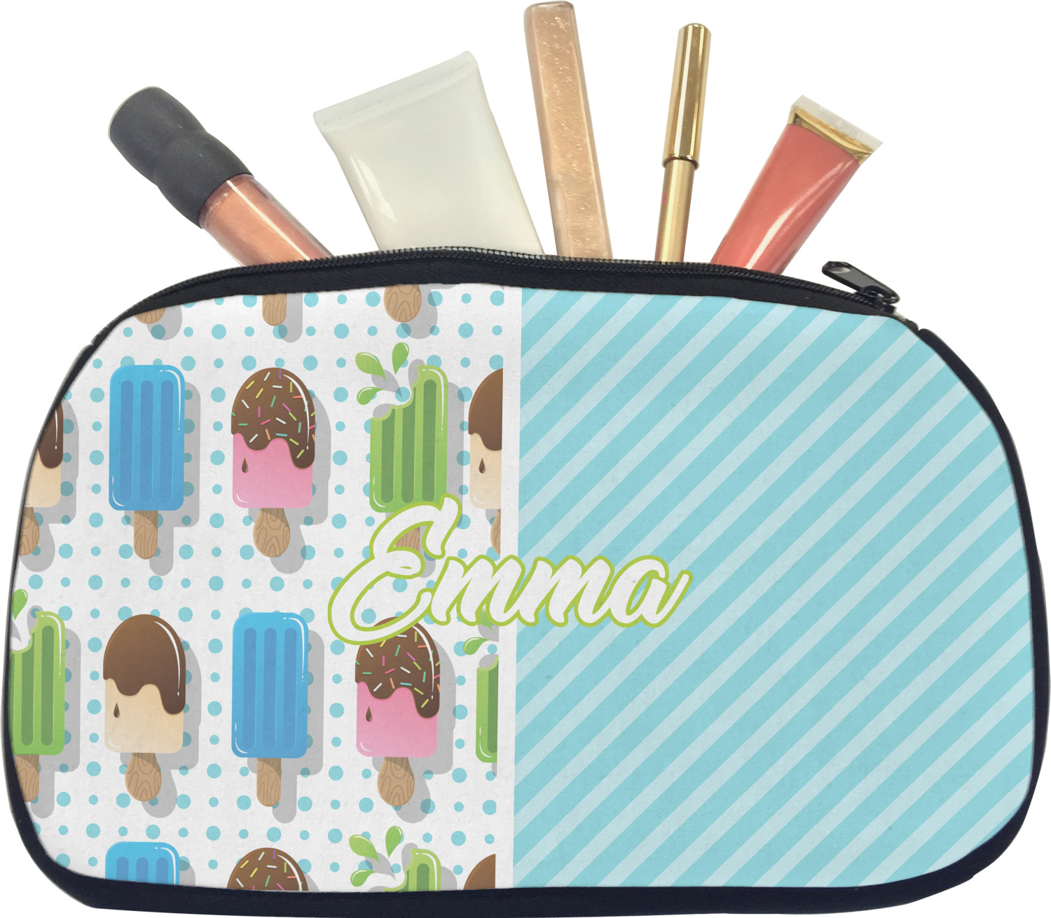 Our personalized makeup bags are available in many different designs, patterns and colors - so you are sure to find one that will love. They are made of neoprene (same material as wet-suits) and thus are water resistant, so spillages in your makeup bag will not end up all over you purse. They are customized on one side and are black on the other side and the zipper is black as well.