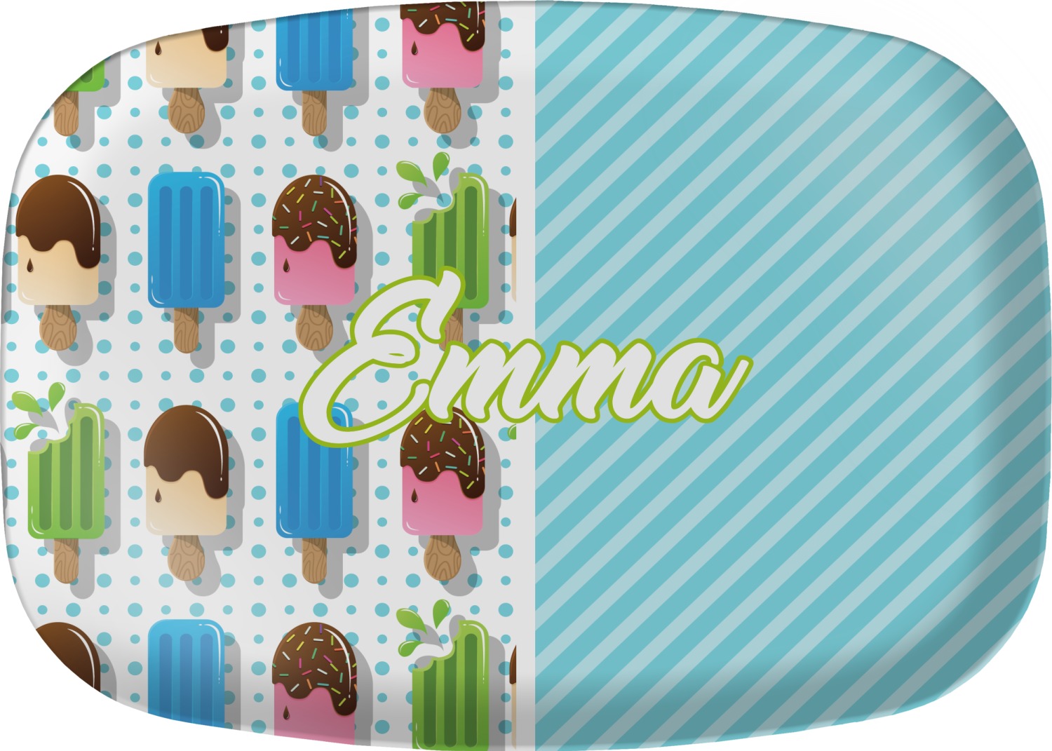 This design is a fun light teal, with pops of lime green and other bright colors. This design is split right down the middle so that you can have two fun patterns on either side The left half are four different kinds of popsicles that repeat in this cute design, with teal polka dots sitting behind them. On the other half is your fun slanted teal stripes pattern.