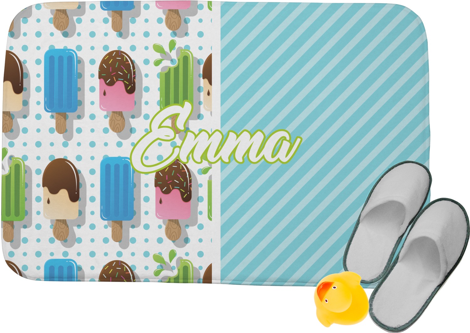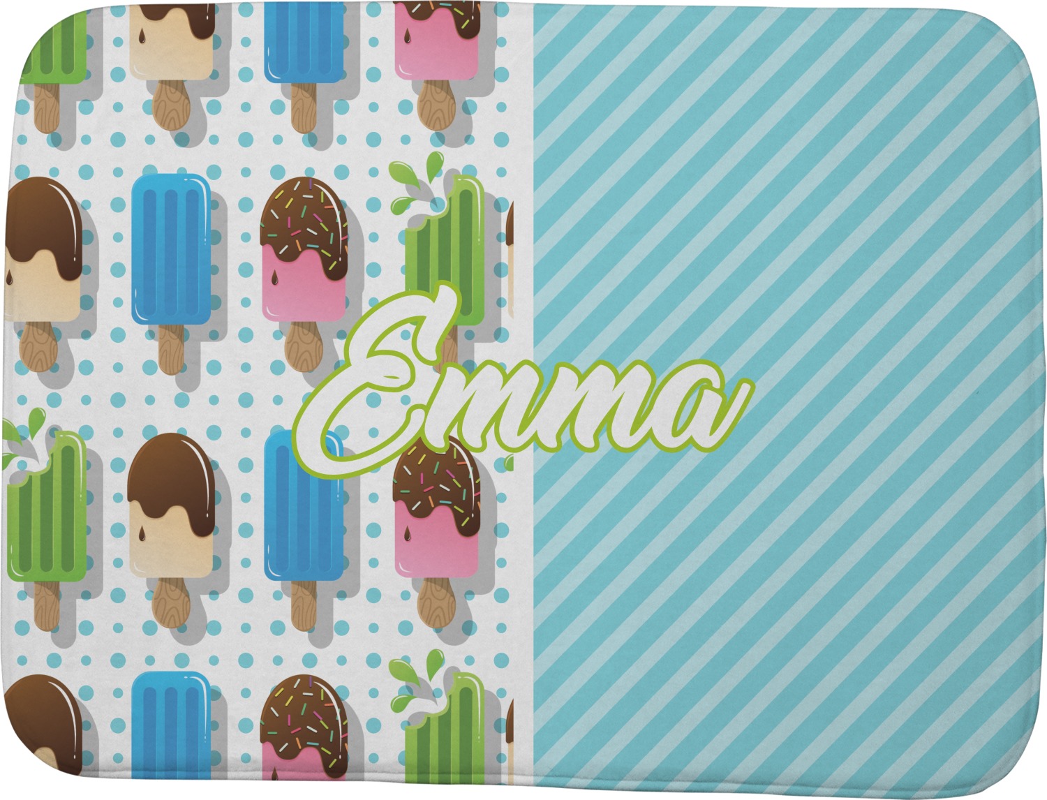 This design is a fun light teal, with pops of lime green and other bright colors. This design is split right down the middle so that you can have two fun patterns on either side The left half are four different kinds of popsicles that repeat in this cute design, with teal polka dots sitting behind them. On the other half is your fun slanted teal stripes pattern.